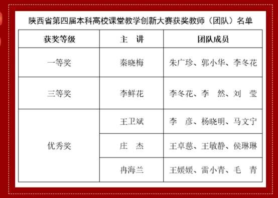 陕西省第四届本科高校课堂创新大赛西安翻译学院获奖教师(团队)名单
