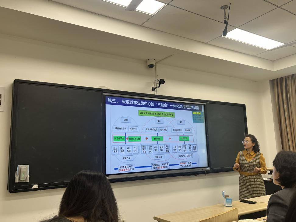 首先,副院长李鲜花教授介绍了以学生为中心的“三融合”一体化混合式教学举措,即课前巩固基础知识,课中拓展知识,课后融入思政教育。通过这种混合式教学模式,并利用线上平台增强师生之间的互动交流,从而提高了学生的综合语言能力。此外,《高级英语》课程还拥有完整的综合评价体系,包括认知、情感和行为等方面,旨在激发学生的内在学习动力。课程设计强调了超越文本理解的审美体验,采用了“阶梯型”教学方法,以满足不同学习需求,并及时反馈以提高学生的参与度。同时,《高级英语》课程紧扣社会需求、学院特色以及国家教育标准,进一步细化了《高级英语》的课程目标。针对教学中存在的问题,如教学工具性和人文性融合不足、评价体系不完善等,确立了“融语言教育与审美”的课程主线,课程的创新成果已得到有效推广。