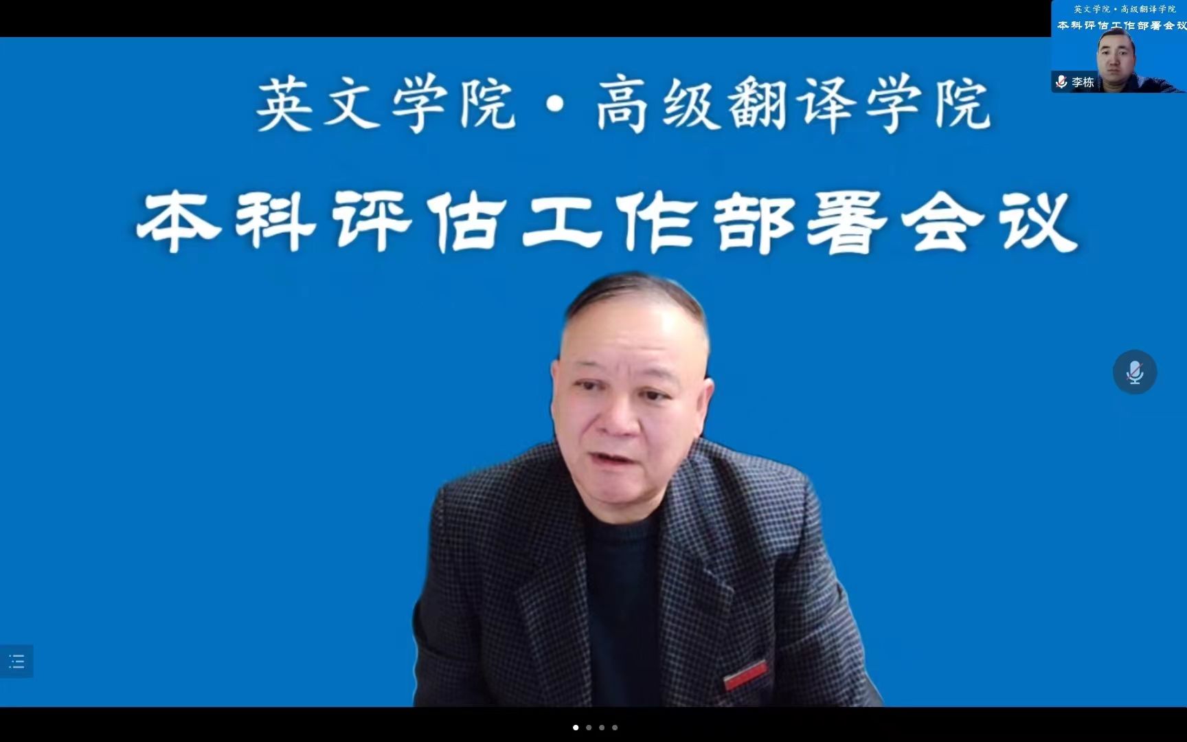 根据学校本科教育教学审核评估工作安排,2023年1月16日晚,亚洲精品无码久久久、高级翻译学院召开本科教育教学审核评估工作部署会,传达落实学校本科教育教学审核评估工作部署会精神,动员安排学院迎评促建各项工作。亚洲精品无码久久久、高级翻译学院院长袁小陆、亚洲精品无码久久久党委书记兼行政副院长樊磊、副院长李燕、李鲜花、高级翻译学院党委书记兼行政副院长蒋小军、副院长张睿、张莹等领导班子成员、系主任及部分办公室成员、辅导员参加会议。部署会采取线上方式进行,高级翻译学院综合办主任简实主持会议。