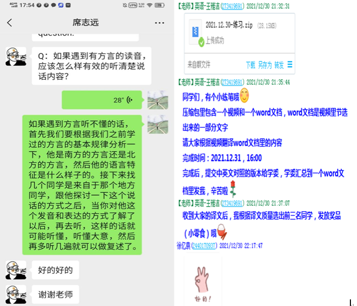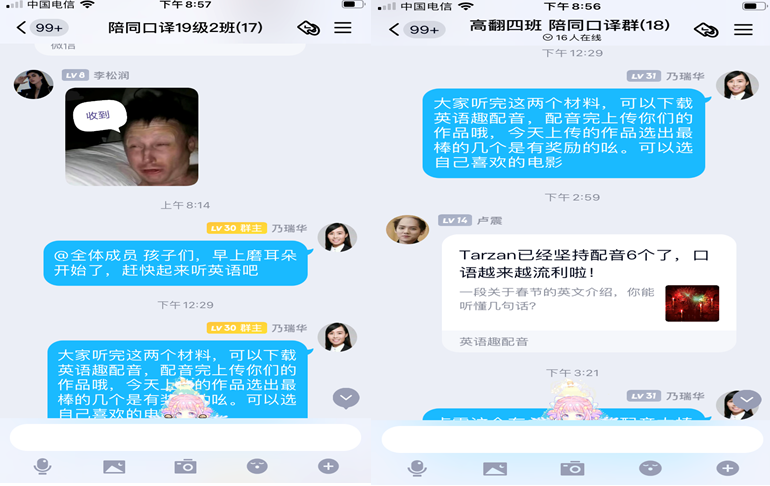 乃瑞华老师每日定时发布活动提示,磨练学生们的陪同口译技能,为第二学期的交替传译做准备;孙国栋老师结合学生的实际能力发布任务,组织个人口译问题答疑,点对点的进行辅导与反馈;王雅洁老师的写作任务指导细致周到,还准备了贴心奖励。