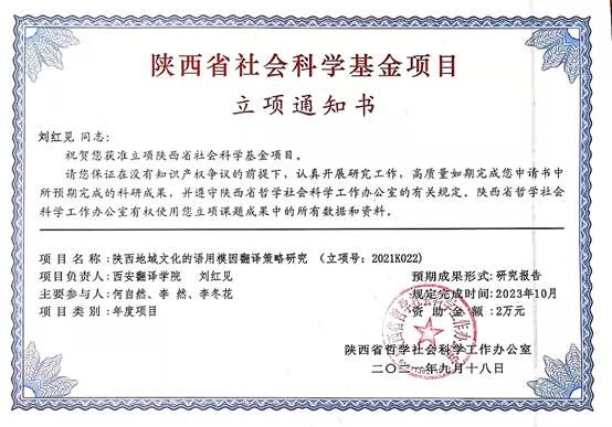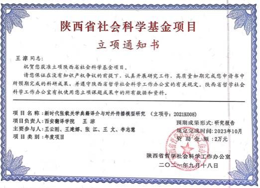 近日,陕西省哲学社会科学工作办公室公示了2021年陕西省社会科学基金年度项目立项名单。我院王淙、刘红见两位教师的课题获批该项目。标志着我院科研能力及水平的实质性提升,坚定了教师们对于申报高层次科研项目的信心,为树立高水平学术形象、推动我院一流专业质量发展,具有里程碑式的意义。