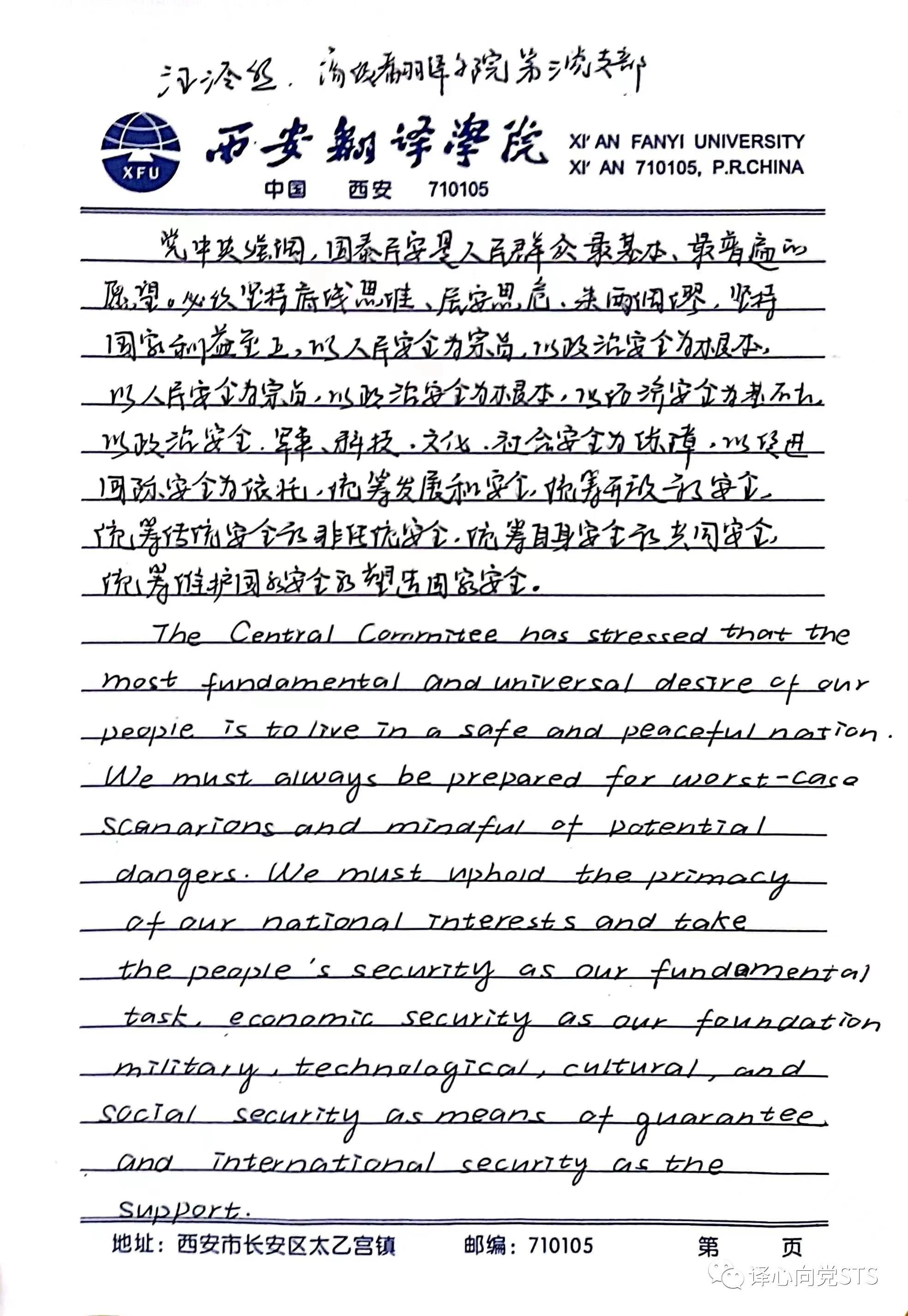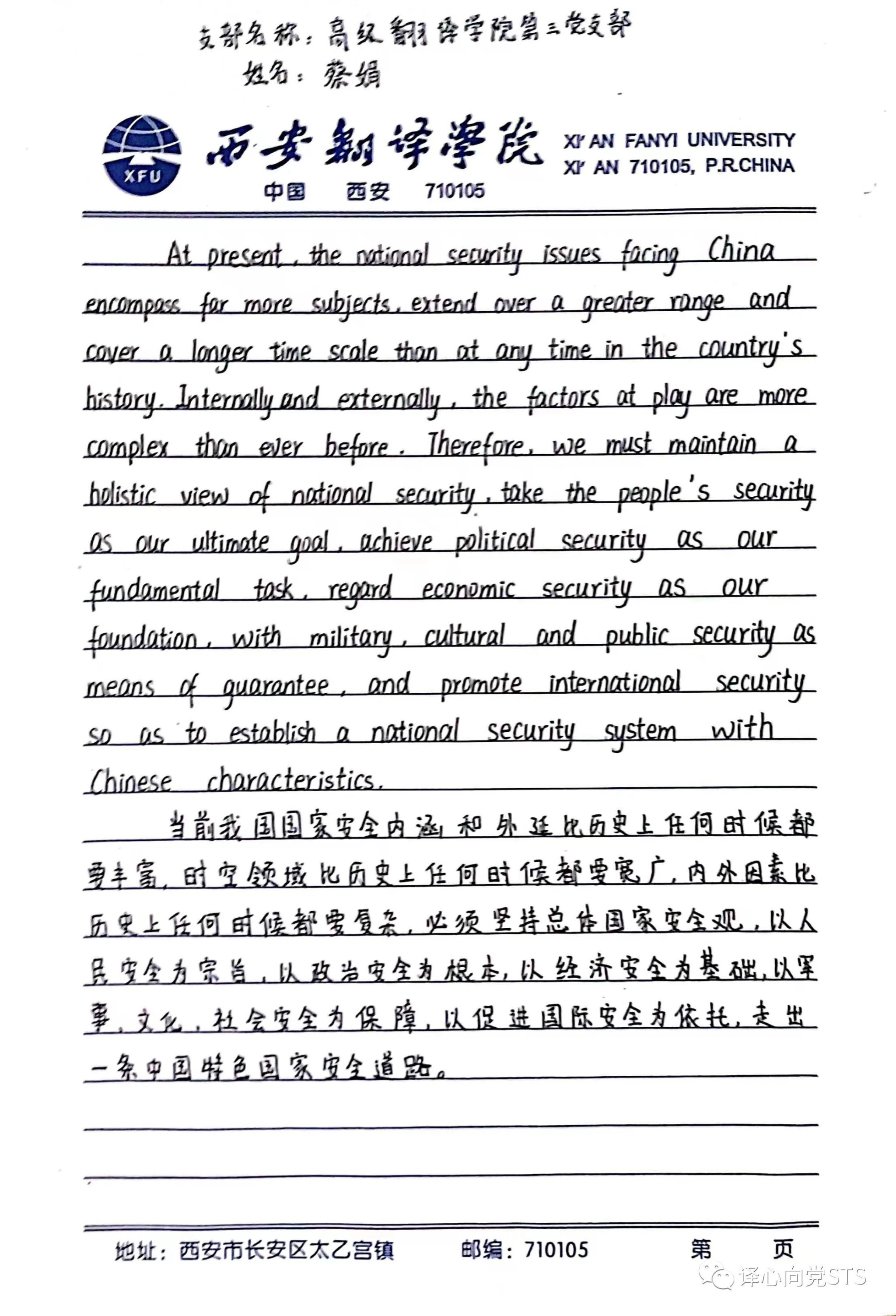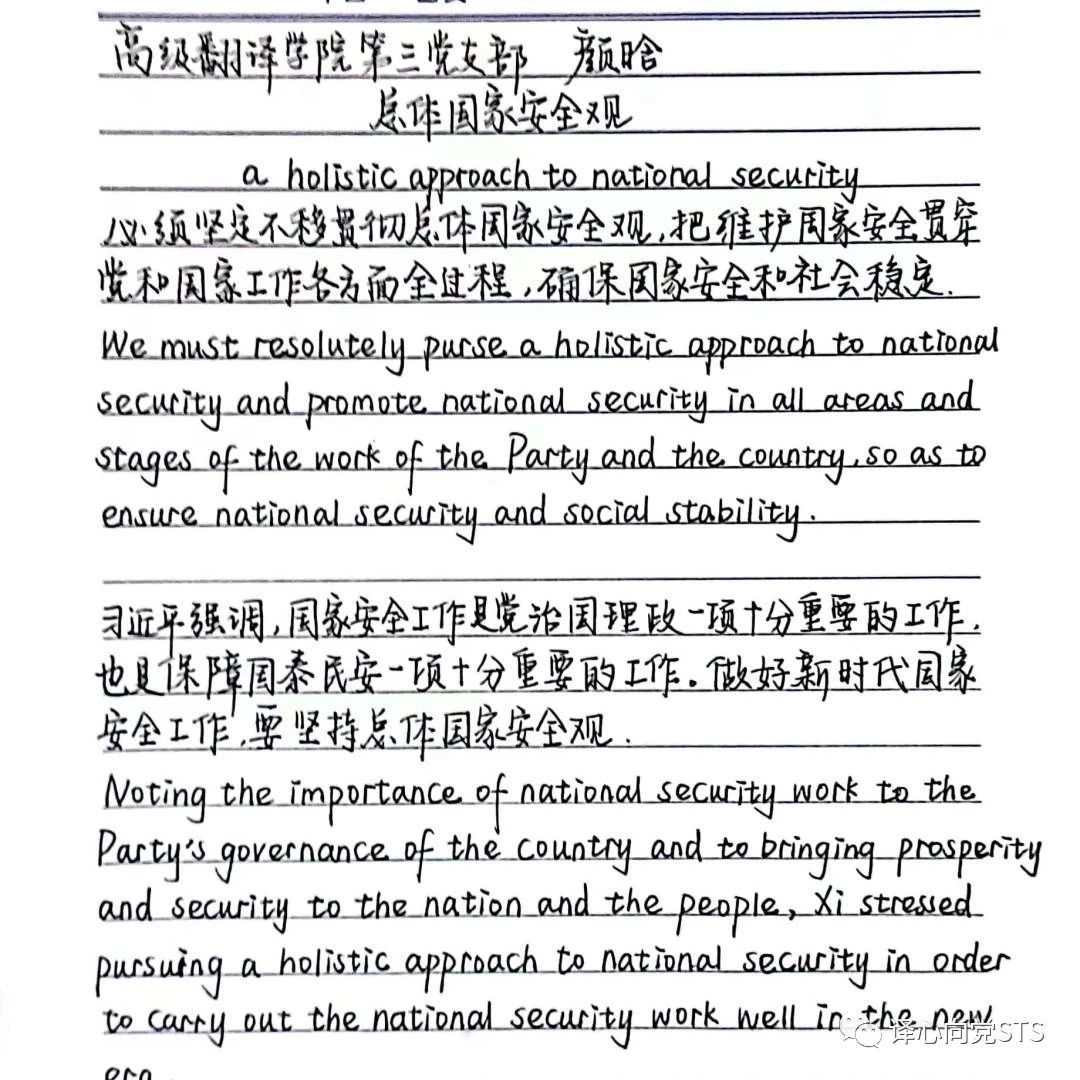 按照党委统一部署和安排,为深入学习贯彻习近平新时代中国特色社会主义思想的学习的整体性和系统性,学深悟透,坚持联系实际、立足岗位。高级翻译学院第三党支部于2023年5月30日晚召开了学习习近平著作选读(第一卷),《坚持总体国家安全观》主题学习。本次学习由支部书记陈晓楠主持,全体党员及入党培养对象参加。本次学习主要内容