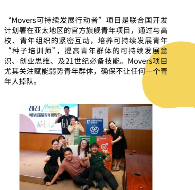2024年6月,联合国开发计划署与中国大学生知行促进计划共同发起Movers4Climate“绿色乡村青年行动”,作为“Movers计划”下的官方青年乡村教育实践项目,旨在通过传授青年人可持续发展及气候知识,提高青年人气候行动素养,鼓励青年人通过支教的形式到乡村去,推动乡村地区的可持续发展及环保教育,关注乡村绿色发展,弥合乡村可持续发展教育鸿沟,确保不让任何一个青少年掉队。Movers4Climate项目发布以来,受到了各个高校团队的强烈欢迎,总计收到379所高校408支团队的报名。