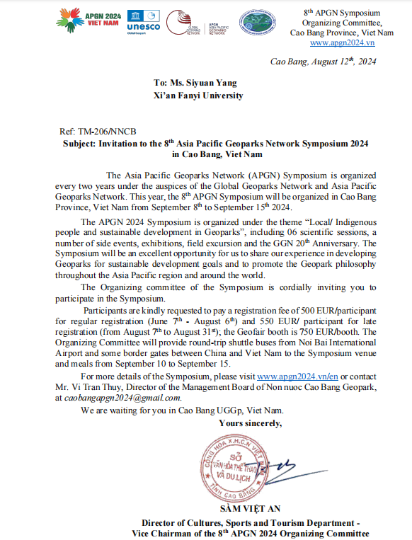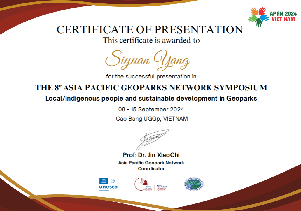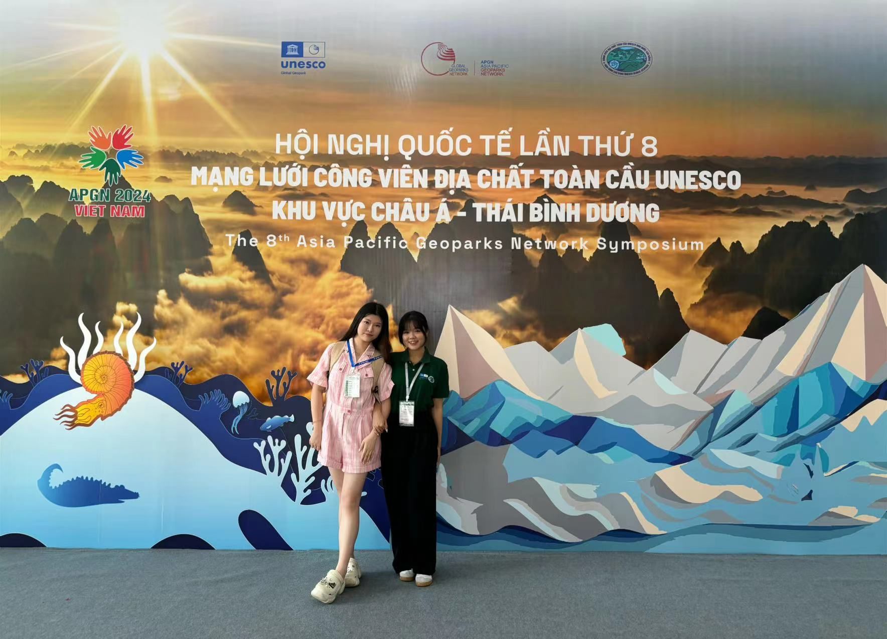 2024年9月11日至9月14日, 第八届亚太地质公园网络研讨会在越南高平省山水地质公园开幕。来自中国、马来西亚、泰国、新西兰、韩国等90个国家的800余名世界地质公园网络的成员、地质学家、公园代表和相关地质从业者参加活动。我院英语系杨斯媛同学受邀在会议上作报告分享。