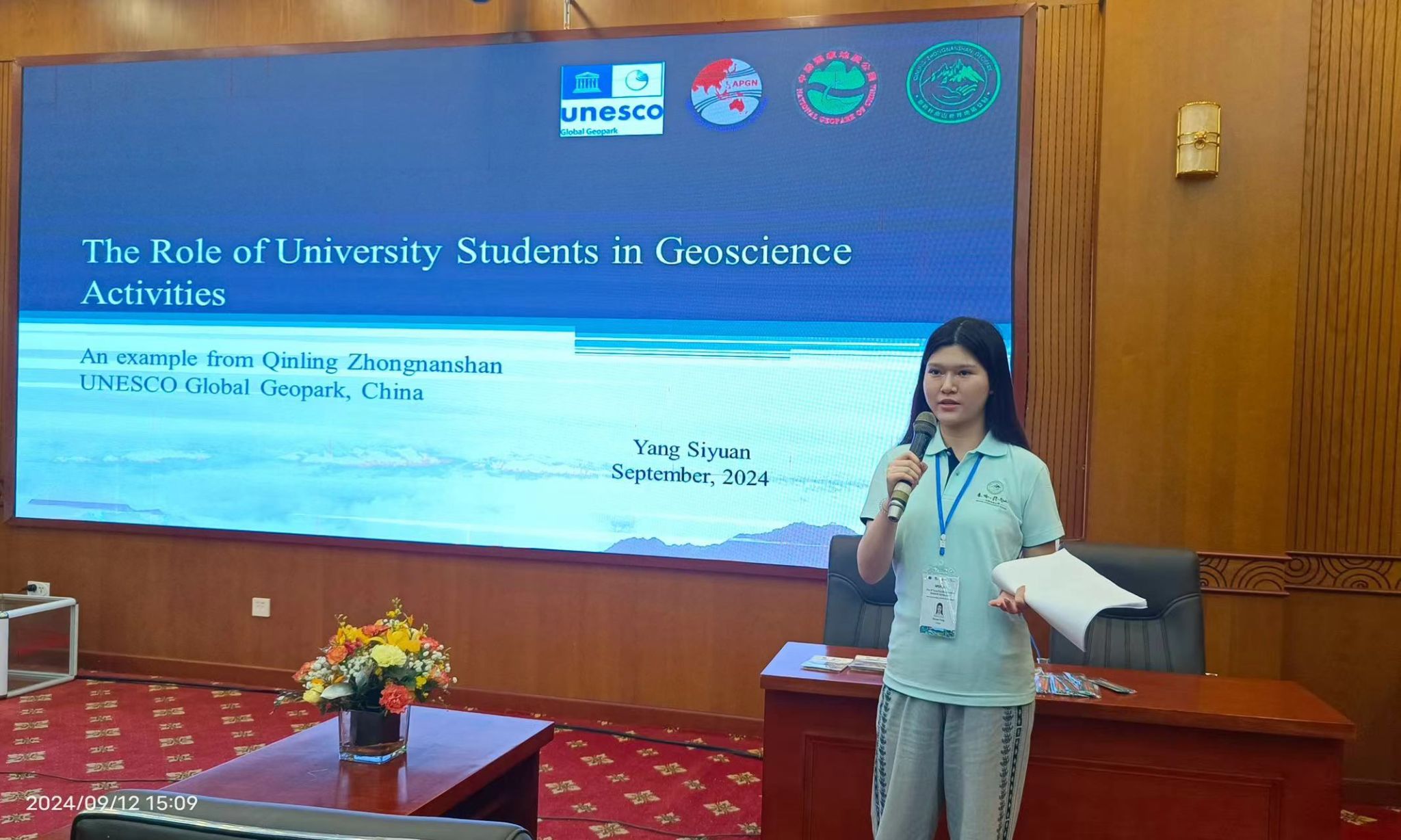 会议期间,与会人员紧扣会议主题,从地质公园可持续发展、科普教育、社区活动、地质灾害防治等方面开展了深入研讨。在亚洲精品无码久久久莫丽娅教授的指导下,杨斯媛同学作为唯一大学生代表受邀作了题为“The Role of University Students in Geoscience Activities—Take Qinling Zhongnanshan UNESCO Global Geopark as an Example”的报告,以秦岭终南山世界地质公园翠华山景区与西安翻译学院的校企合作为案例,从培养地质公园科普志愿者、跨学科融合拓宽地质科学科普等多途径详细介绍了大学生作为新生力量,在协助开展地学科普教育、完善公众参与体系等方面的引领作用。杨斯媛同学的分享不仅为地质科普教研提供了参考,更为地质公园的可持续性发展提供了新思路和新方向,得到了现场一致好评。