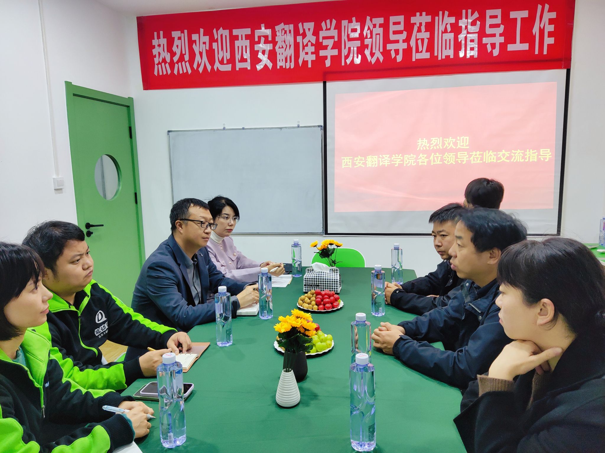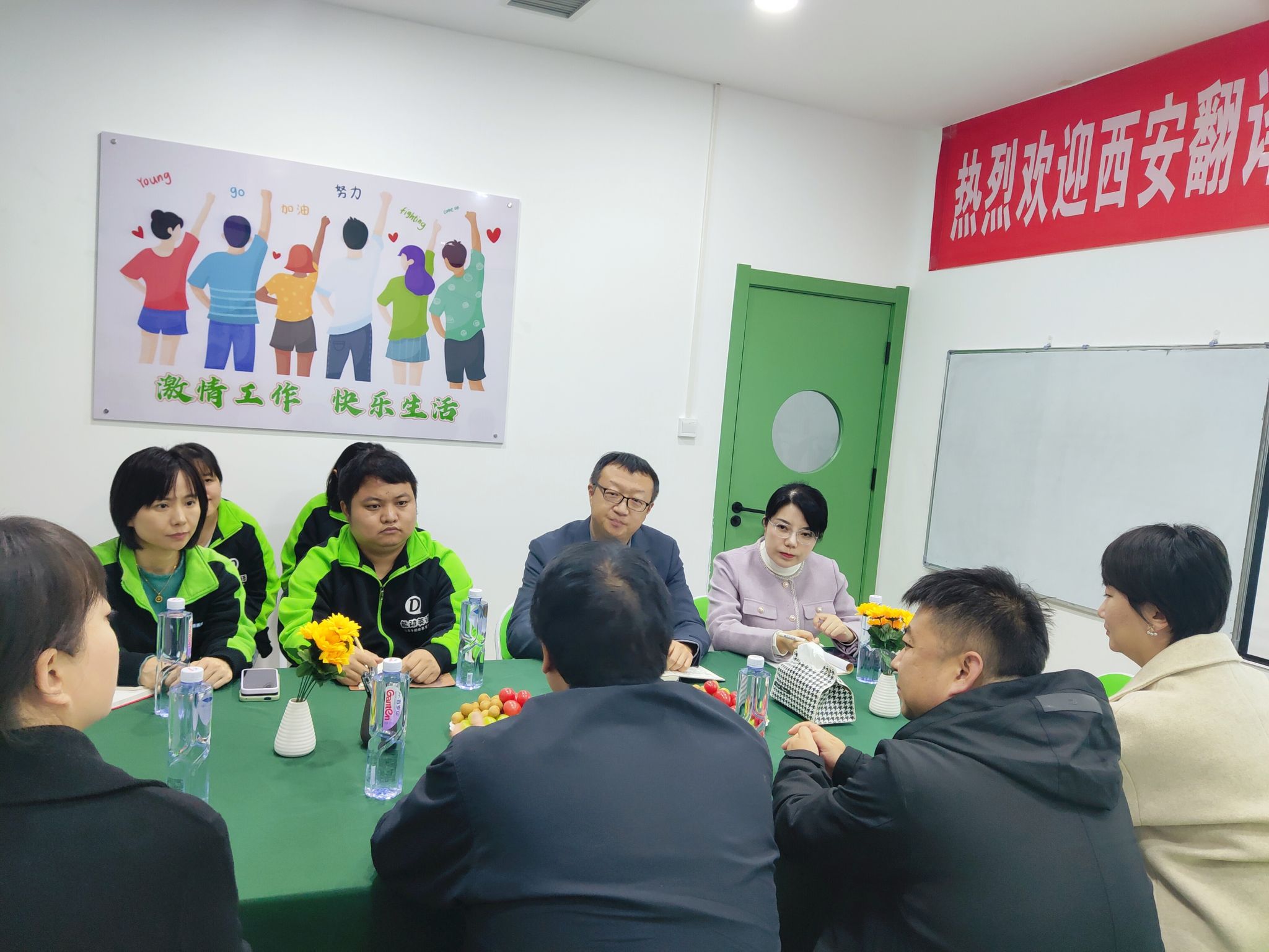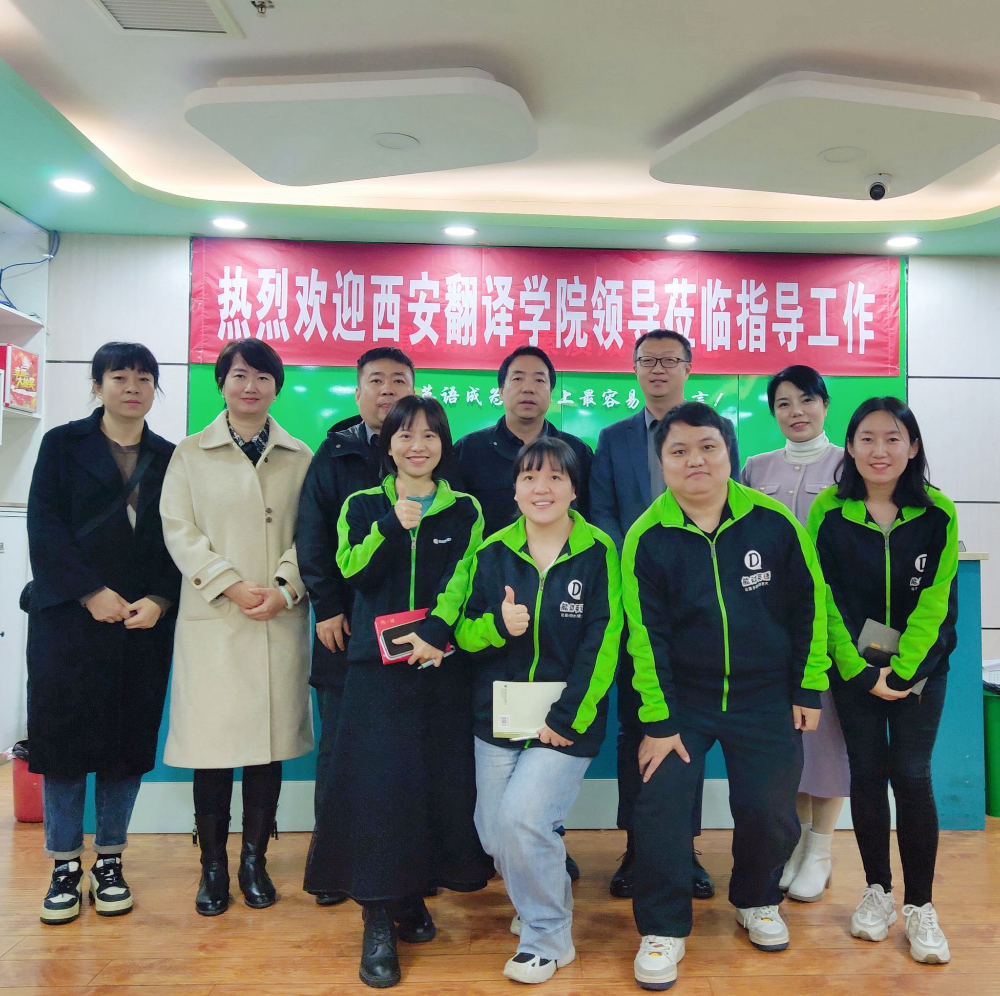 11月15日晚,西安翻译学院亚洲精品无码久久久党委书记、副院长蒋小军,综合办副主任曾维民,毕业班就业联络人魏婧以及辅导员刘媛媛一行四人,到访睿德乐思集团旗下能动英语西工大校区,旨在进行访企拓岗活动,进一步拓宽学生实习和就业渠道。