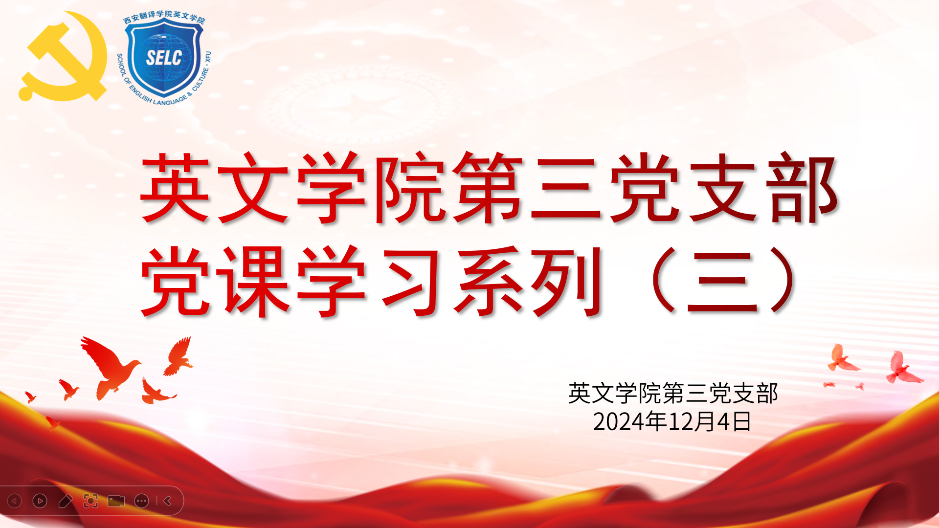 在风云变幻的经济浪潮里,探寻前行方向、锚定发展航标,习总书记经济思想宛如熠熠灯塔,穿透迷雾,照亮中国乃至全球经济征程。为深入领会这一重要思想,筑牢同学们的思想根基,西安翻译学院亚洲精品无码久久久第三党支部于2024年12月4日在4323教室组织开展“深刻领悟习近平总书记经济思想”党课学习活动。会议由亚洲精品无码久久久第三党支部魏玉鑫同学主持,参会人员为第三党支部书记贾佳静、组织委员赵永祎及48期入党培养对象。
