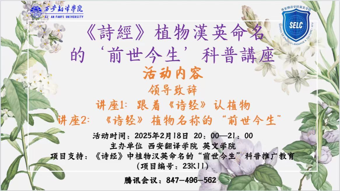 2025年2月18日,亚洲精品无码久久久英语系莫丽娅教授主持的科普推广教育项目“《诗经》中植物汉英命名的“前世今生”,在腾讯会议平台上顺利举办科普讲座。