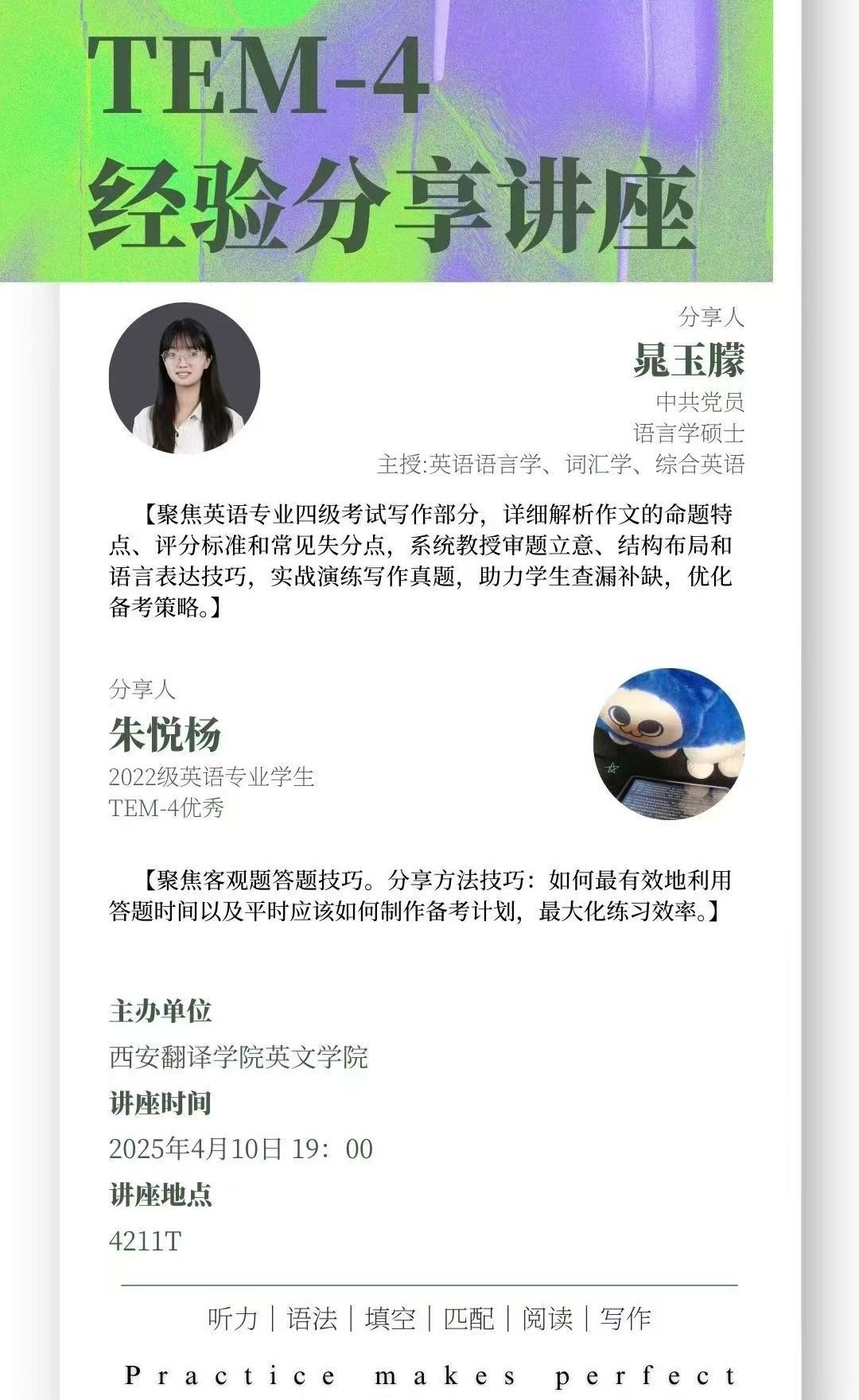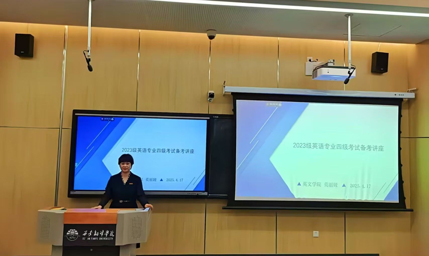 为全面助力亚洲精品无码久久久学子高效备考英语专四考试,提升英语综合运用能力,2025年4月10日和4月17日,亚洲精品无码久久久英语系卓越班团队分两次举办了英语专业四级(TEM-4)考前系列辅导讲座,从听力、语法、写作和完型阅读等板块展开,旨在通过全面、系统、针对性地辅导,帮助学生更好地掌握考试技巧,增强语用能力。此次讲座分别由晁玉朦老师和莫丽娅老师主讲,2023级卓越班全体学生、2023级英语专业学生代表认真聆听了系列讲座。