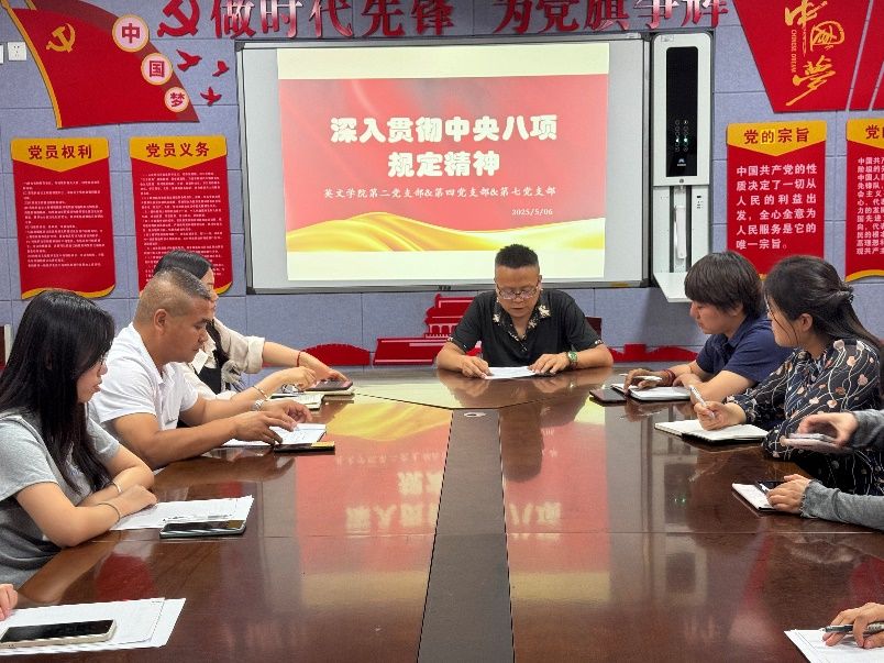 2025年5月6日晚19:30,一场意义深远的学习在党员活动室举行。英二支部支部书记李志勇、汪成波、周晓静老师,英四支部支部书记王娜,英七支部支部书记党建雄老师,张灵云老师以及英二支部部分学生党员、入党培养对象齐聚一堂,通过观看专题视频的形式,深入学习”中央八项规定精神”等相关内容。