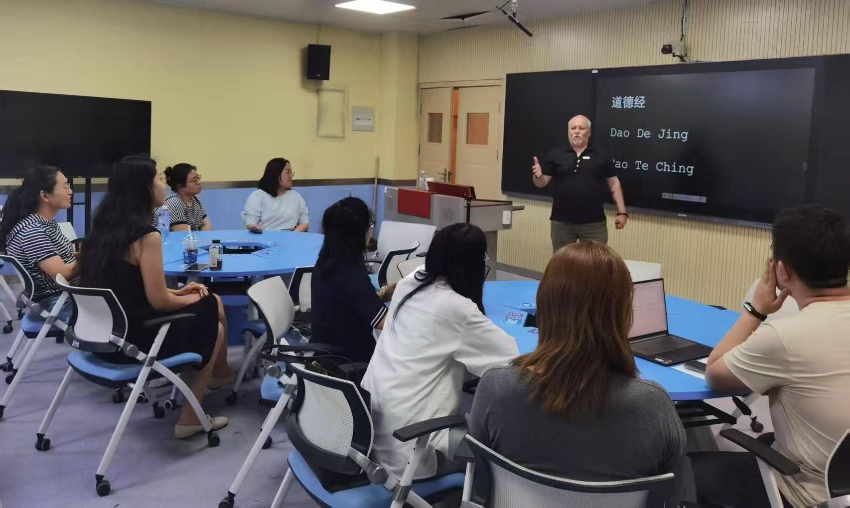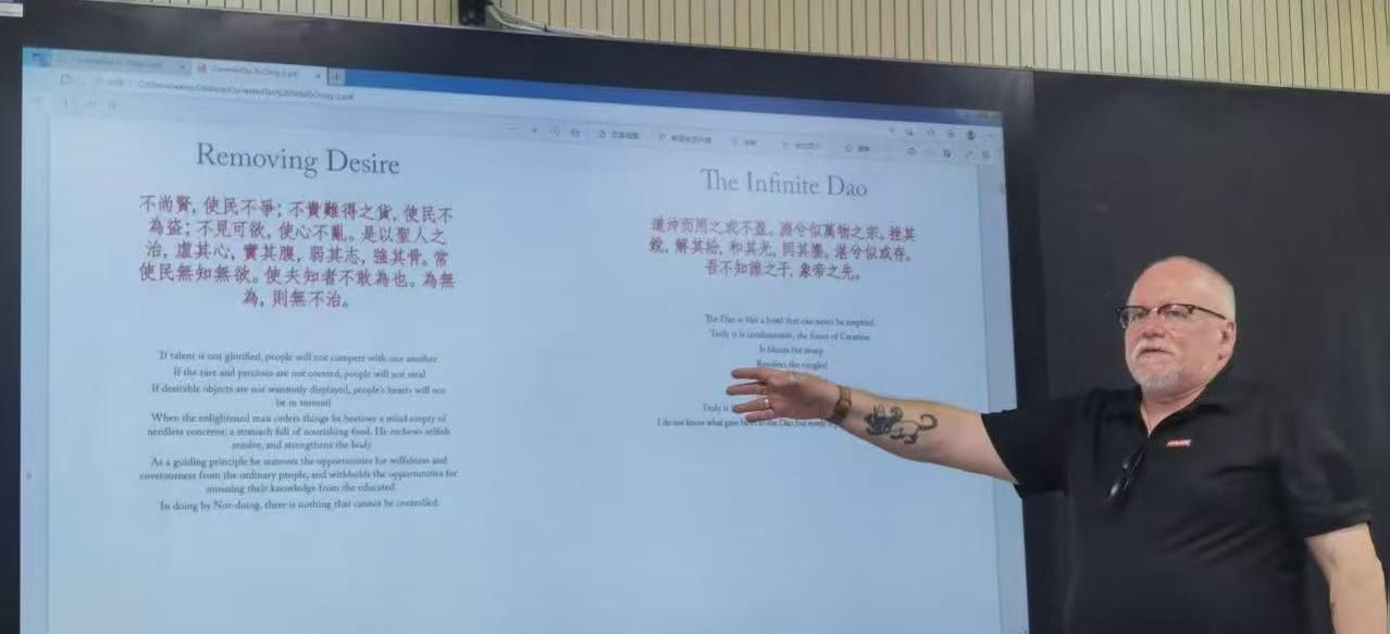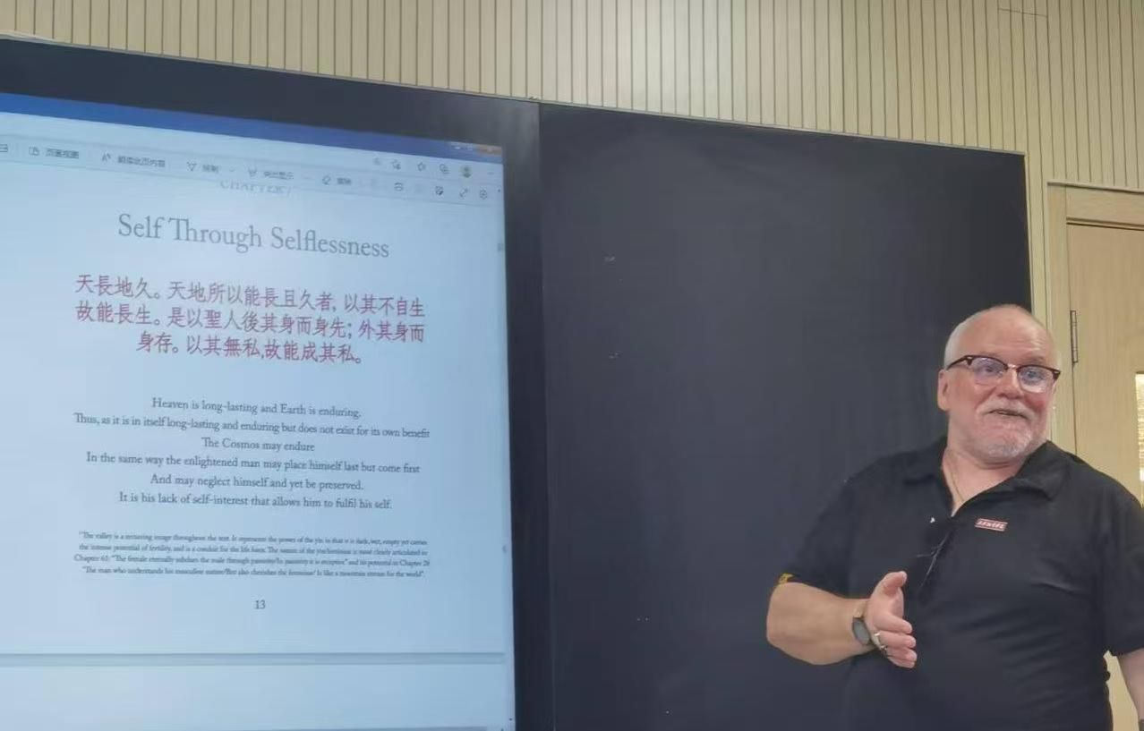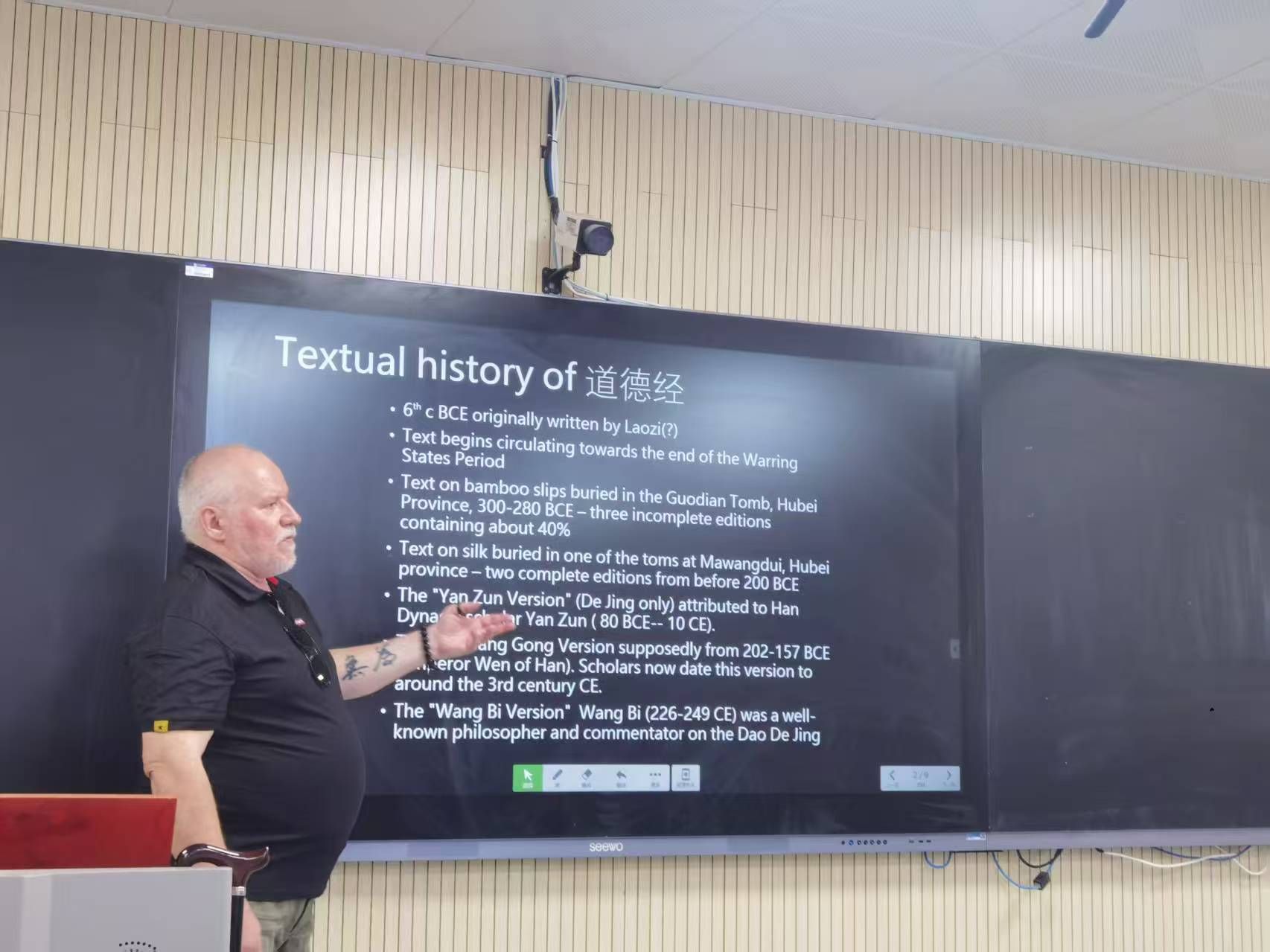 为了提升我校师生在中华文化外译领域的专业水平,拓宽学术视野,加强国际文化交流与合作,特邀英国汉学家、翻译家、我校客座教授James Trapp(蒲华杰)来我校开展一系列的学术交流活动。5月22日下午,蒲华杰教授为亚洲精品无码久久久师生代表分享了《道德经》的翻译心得,从文本成书、翻译实践、哲学概念阐释及中西文化互动等维度展开探讨,揭示这部东方经典在全球化语境中的独特魅力与传播挑战。