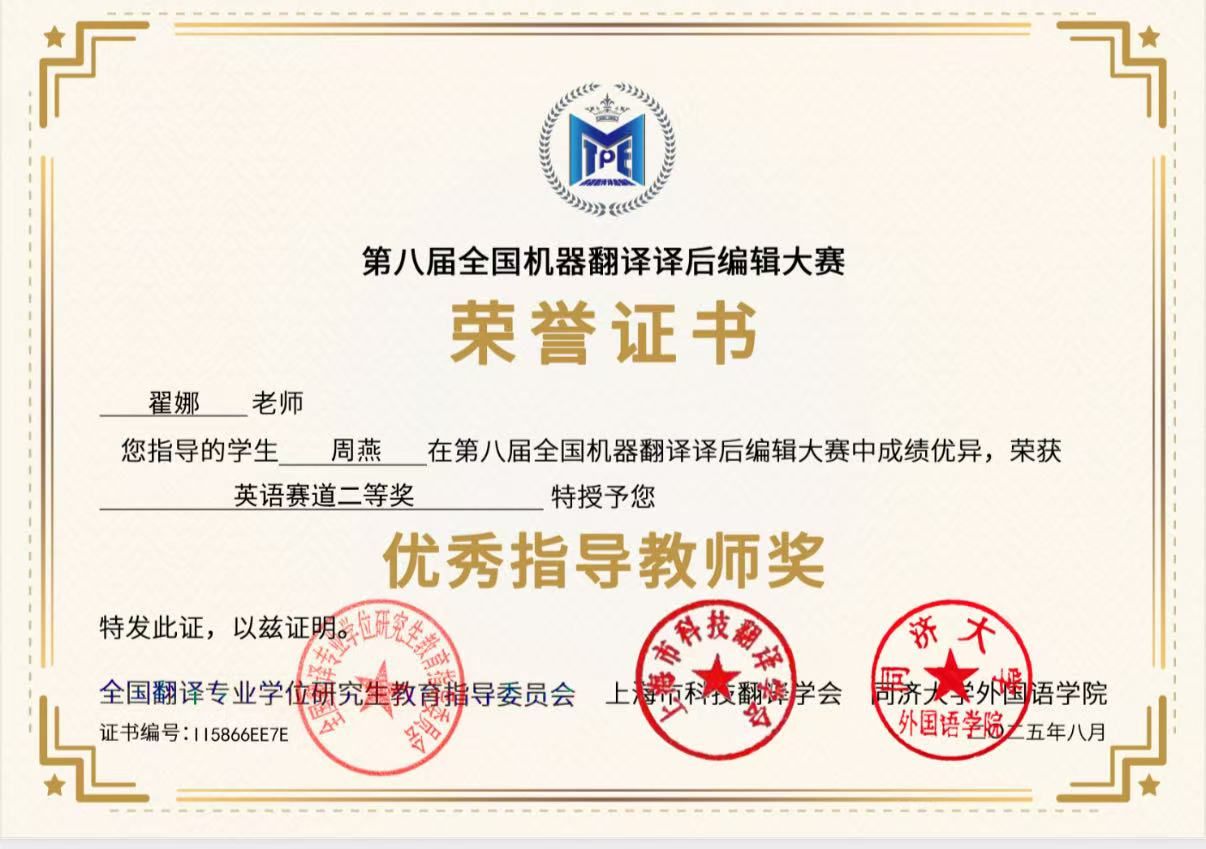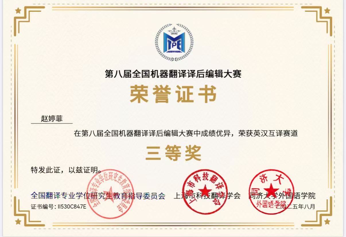 2025年4月至7月,第八届全国机器翻译译后编辑大赛圆满落幕。历经近四个月的激烈角逐与严谨评审,最终获奖名单正式揭晓。我校亚洲精品无码久久久翻译与英语专业的多位学子在全国赛场上脱颖而出,喜获佳绩。翻译专业2023级学生周燕荣获二等奖,英语专业2023级学生吴帆、赵婷菲、韦雅婷获得三等奖。与此同时,我院荣获“优秀组织单位”称号。本届大赛规模盛大,来自西安交通大学、上海外国语大学、西安外国语大学、大连外国语大学、香港岭南大学等全国知名高校的172位 优秀选手们同台竞技、各展风采,共同呈现了一场高水平的人机协作翻译盛宴。