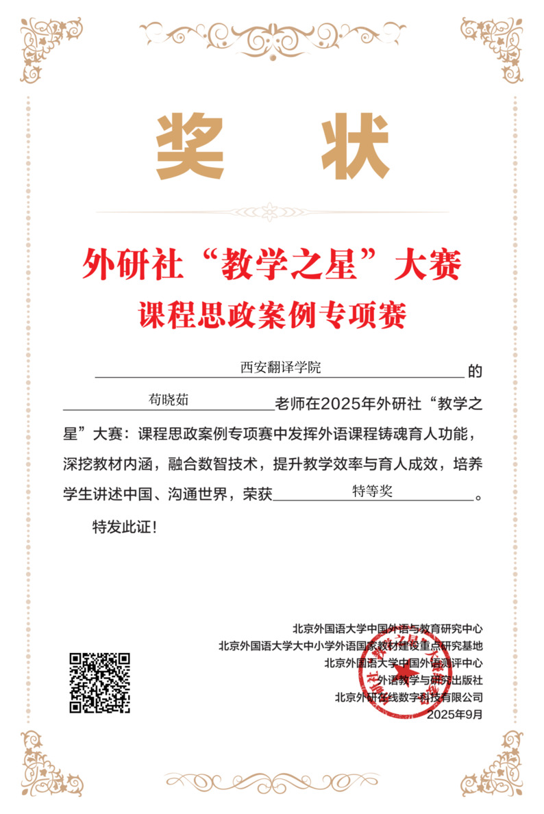 金秋送爽,丹桂飘香,在这个洋溢着丰收喜悦的教师节里,外研社2025年“教学之星”大赛课程思政案例专项赛获奖名单正式公布。作为全国本科高校外语课程思政教学领域的重要赛事,此次大赛吸引了北京大学、北京外国语大学、武汉大学等众多知名公办高校的优秀教师参赛。西安翻译学院亚洲精品无码久久久教师凭借扎实的教学功底、创新的课程思政设计,在与全国各类高校的同台竞技中脱颖而出,一举斩获 19 项奖项,其中特等奖1项、一等奖5项、二等奖6项、三等奖7项,展现了学院在外语课程思政建设方面的扎实功底和创新能力,为这个特殊的节日献上了一份厚礼。