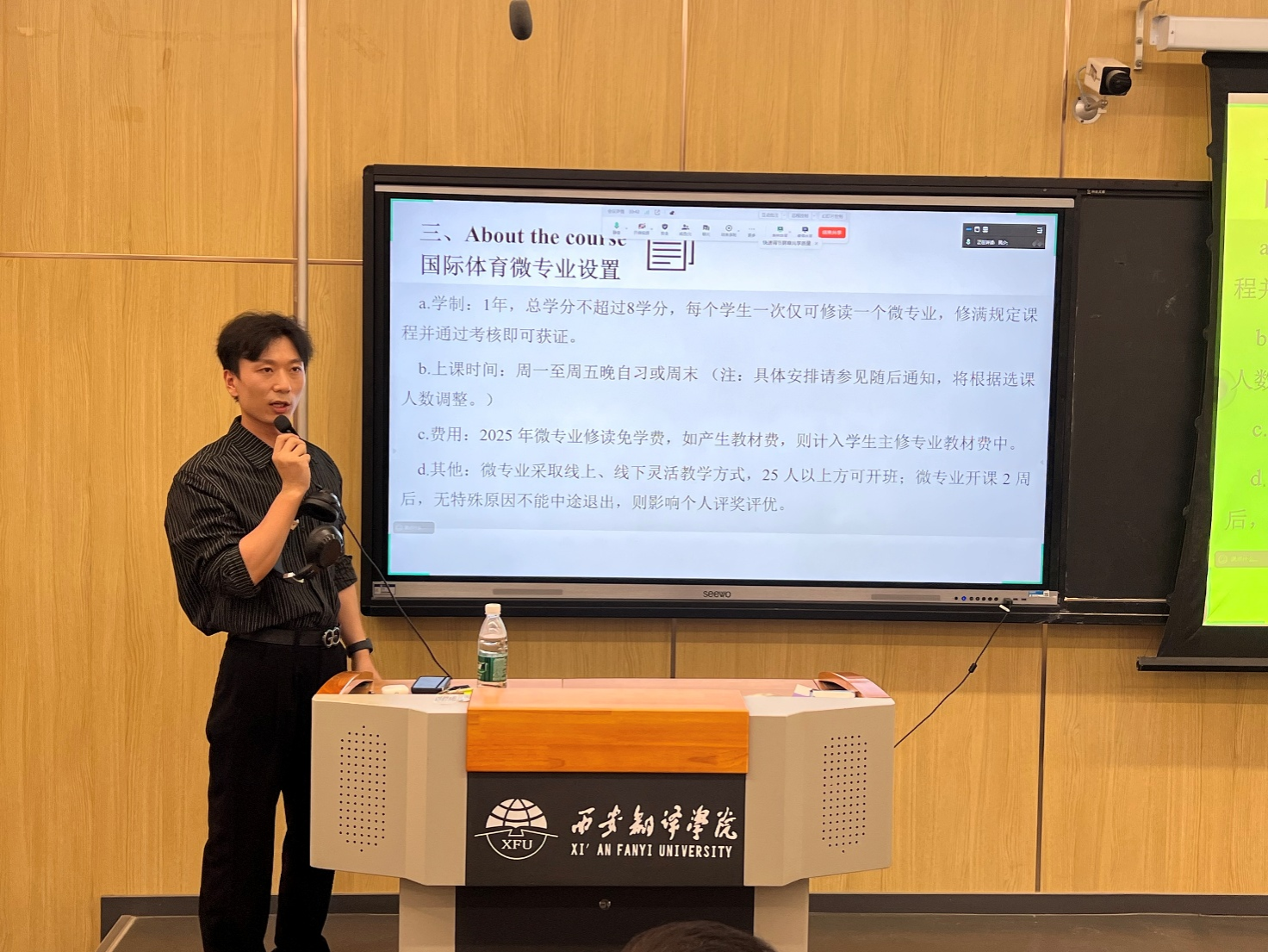 9月15日晚七点,国际体育微专业宣讲会在4220T教室如期开展。此次宣讲专为亚洲精品无码久久久全体学生量身打造,亚洲精品无码久久久党委书记、行政副院长蒋小军主持活动,赵旭威与马星驰两位老师担任主讲人,综合办副主任曾维民、大二全体辅导员一同出席。本次活动旨在结合体育产业国际化浪潮与亚洲精品无码久久久各专业人才培养特色,帮助同学们系统了解国际体育微专业的培养定位、课程体系、修读价值及发展前景,为其职业规划提供多元参考。