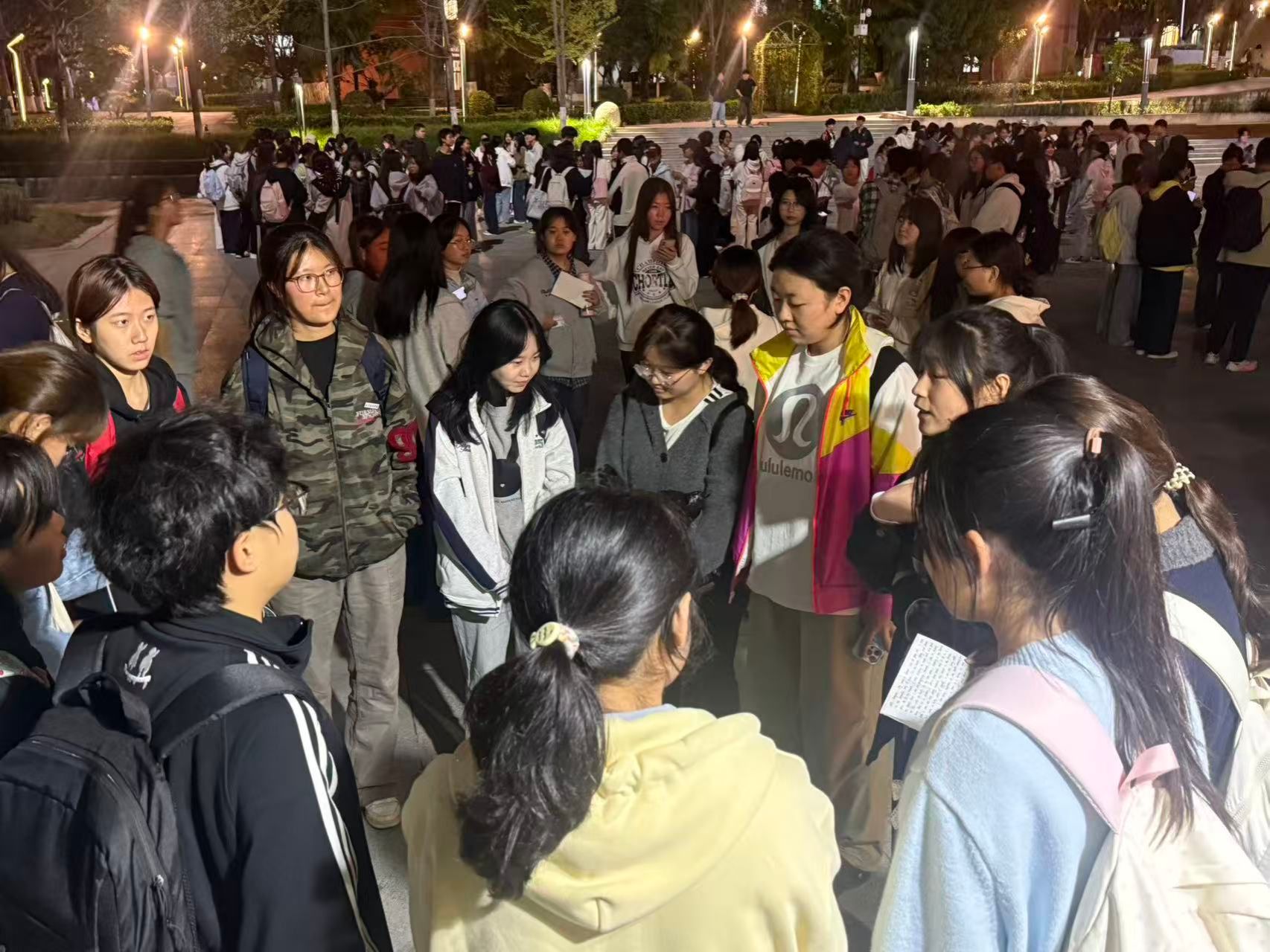 口语角现场,新生们带着崇拜与求知的心态,积极投入对话,在真实的语言应用中感受英语的魅力,对专业学习有了更生动的体会。现场气氛热烈而融洽,欢声笑语与朗朗英语交织,构成了夜幕下校园里最动人的图景。