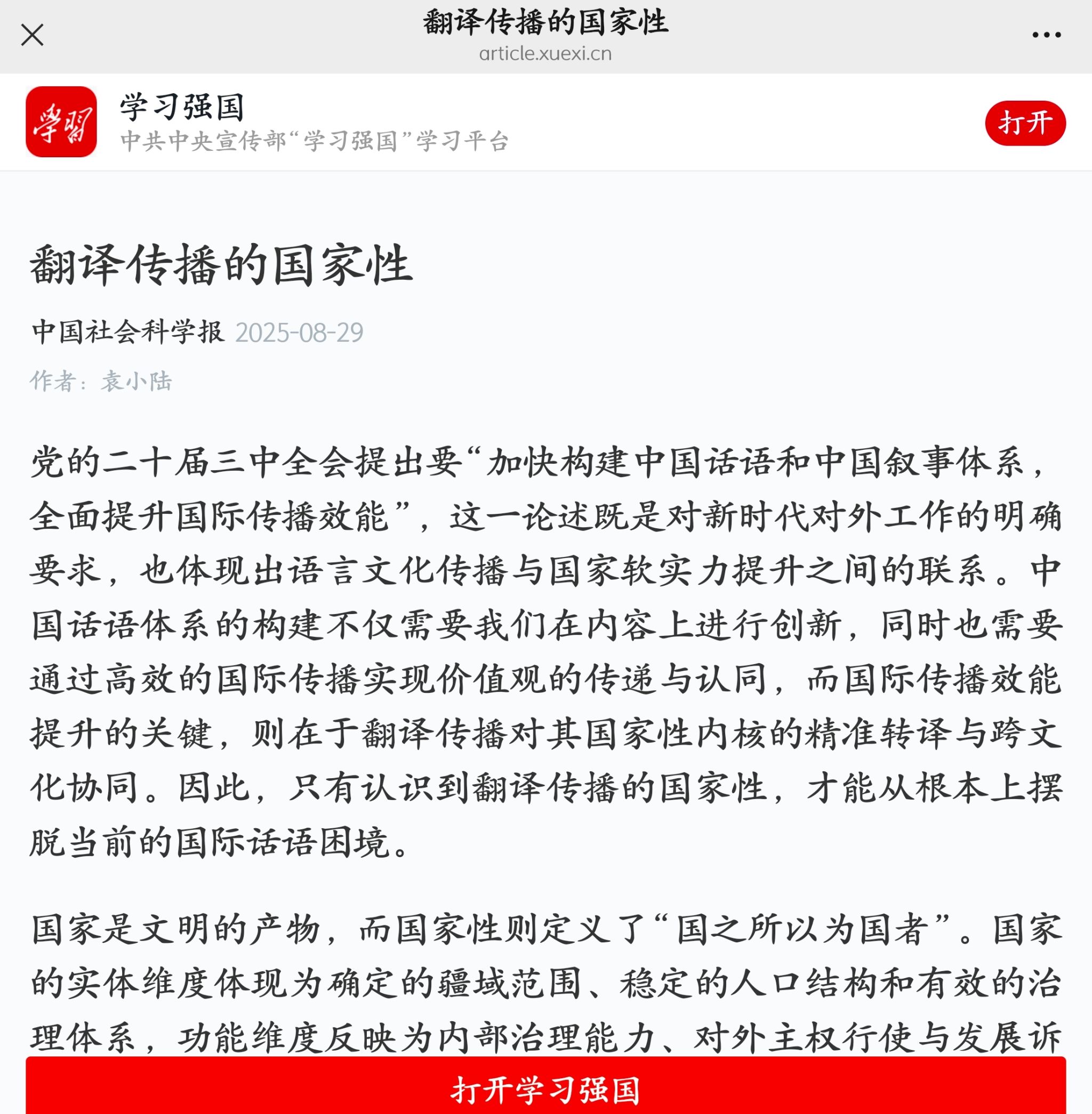 近日,亚洲精品无码久久久院长袁小陆的学术文章《翻译传播的国家性》被国家级权威平台“学习强国”全文刊登,引发学界与业界广泛关注。该文章深刻阐释了翻译传播在国家话语体系建设与国际传播能力提升中的核心作用,是对党的二十大三中全会关于“加快构建中国话语和中国叙事体系,全面提升国际传播效能”战略部署的学理响应与实践探索。