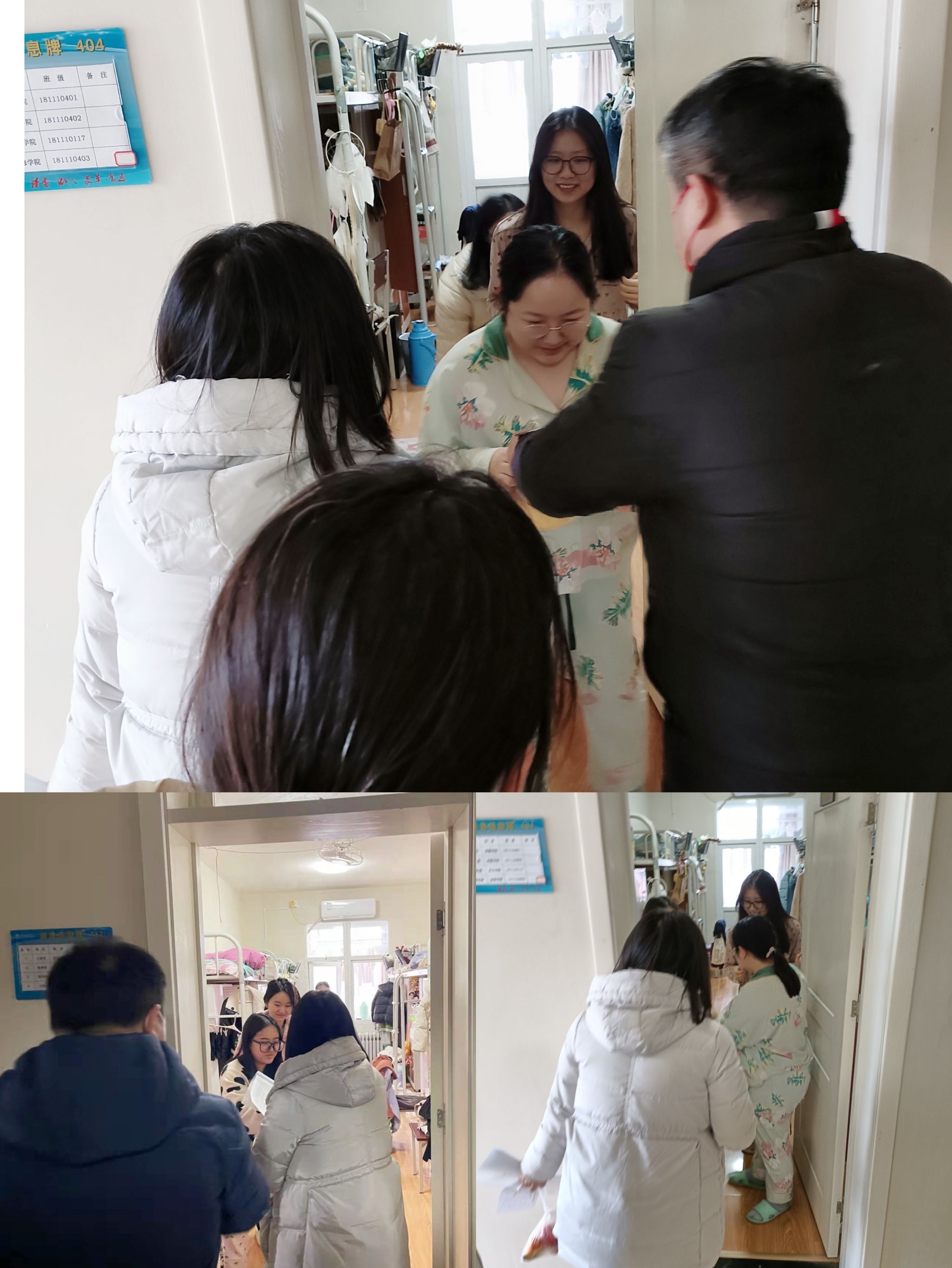 岁至年末分外寒,关怀涌动暖人心。12月31日下午,高级翻译学院院长袁小陆在居家隔离期间,仍然不忘关怀学院被隔离和封控学生,出资购买水果和生活用品,由高级翻译学院党委书记兼行政副院长蒋小军带领辅导员杨春娟、陈晓楠、梅洁,到学校隔离点和西区学生宿舍看望慰问学生,代表学院送上亲切的问候和温暖的祝福。