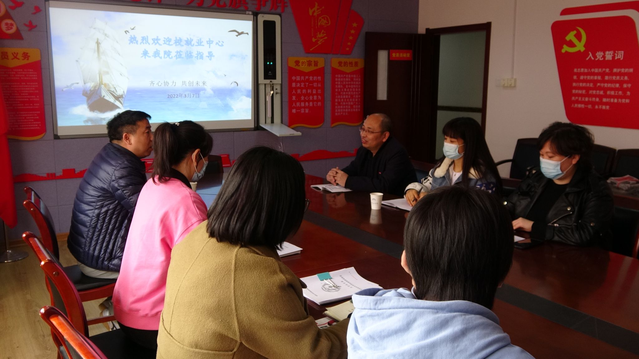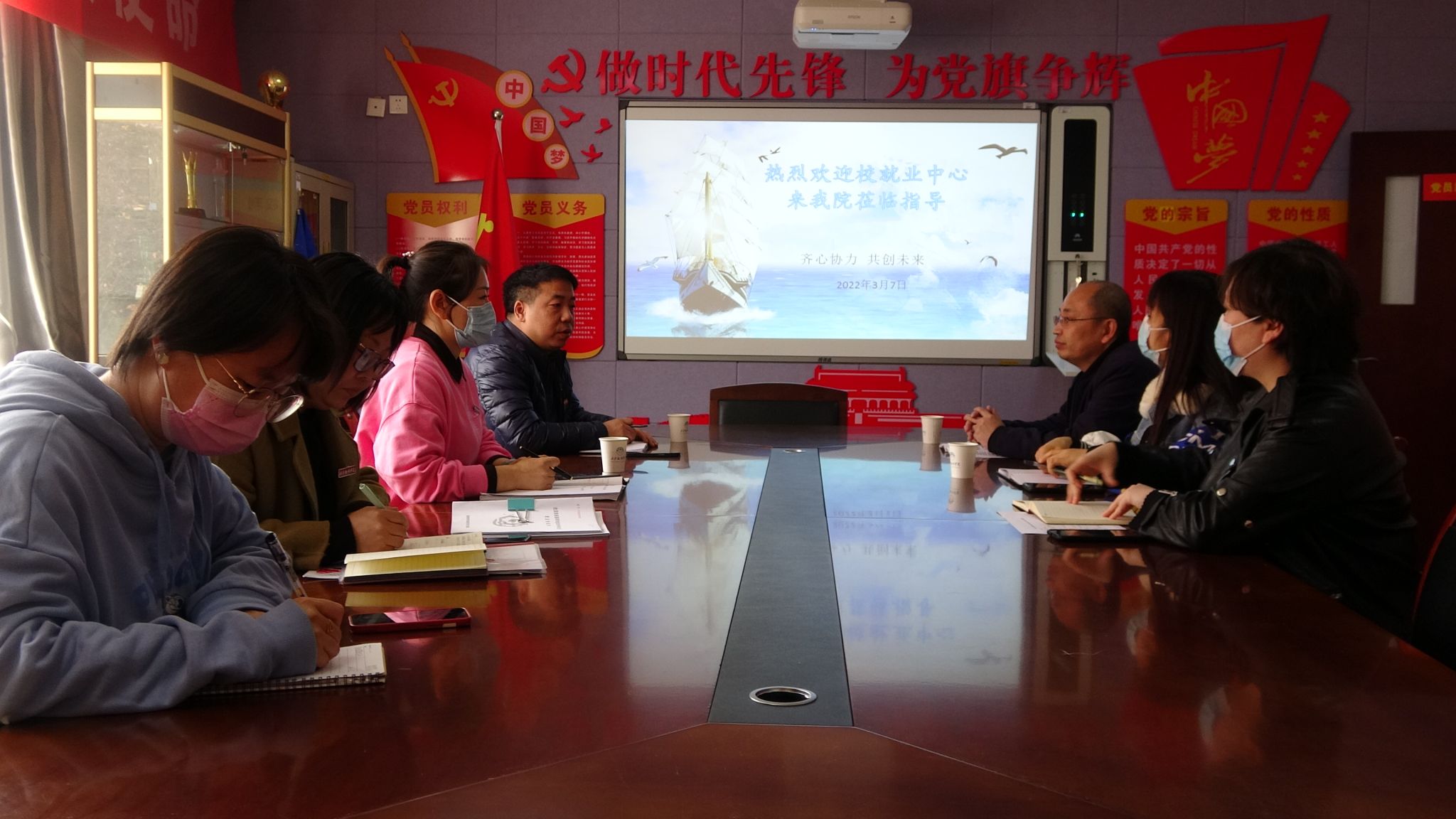 为做好2022届毕业生就业指导服务工作,了解毕业生求职心态,引导毕业生正确认识就业形势,积极开展多渠道就业工作,3月7日下午,高级翻译学院举行2022届毕业生就业形势调研座谈会。就业指导中心副主任赵东良莅临指导。高级翻译学院党委书记、副院长蒋小军,就业事务专员郭萍,学工办主任刘红娟、学工干事刘媛媛,2018级辅导员杨春娟、陈晓楠参加调研座谈会。会议由蒋小军主持。