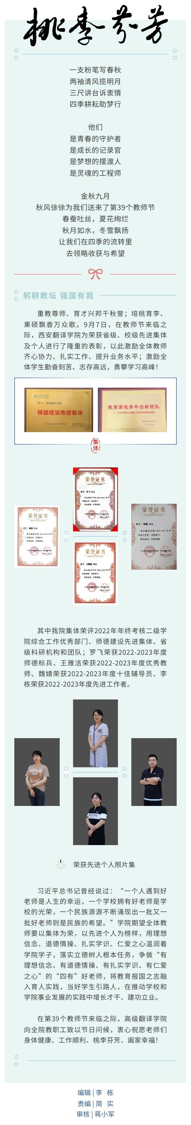 在第39个教师节来临之际,高级翻译学院向全院教职工致以节日问候,衷心祝愿老师们身体健康、工作顺利、桃李芬芳、阖家幸福!