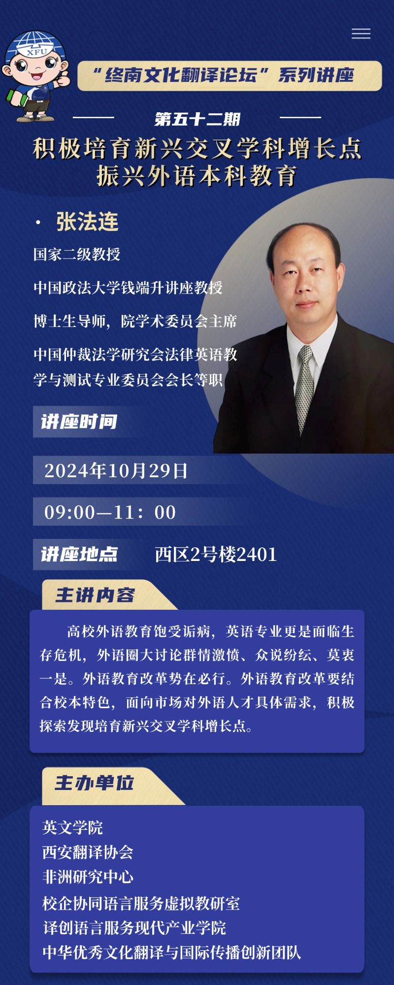 主题:“终南文化翻译讲坛”系列讲座第五十二期——积极培育新兴交叉学科增长点 振兴外语本科教育