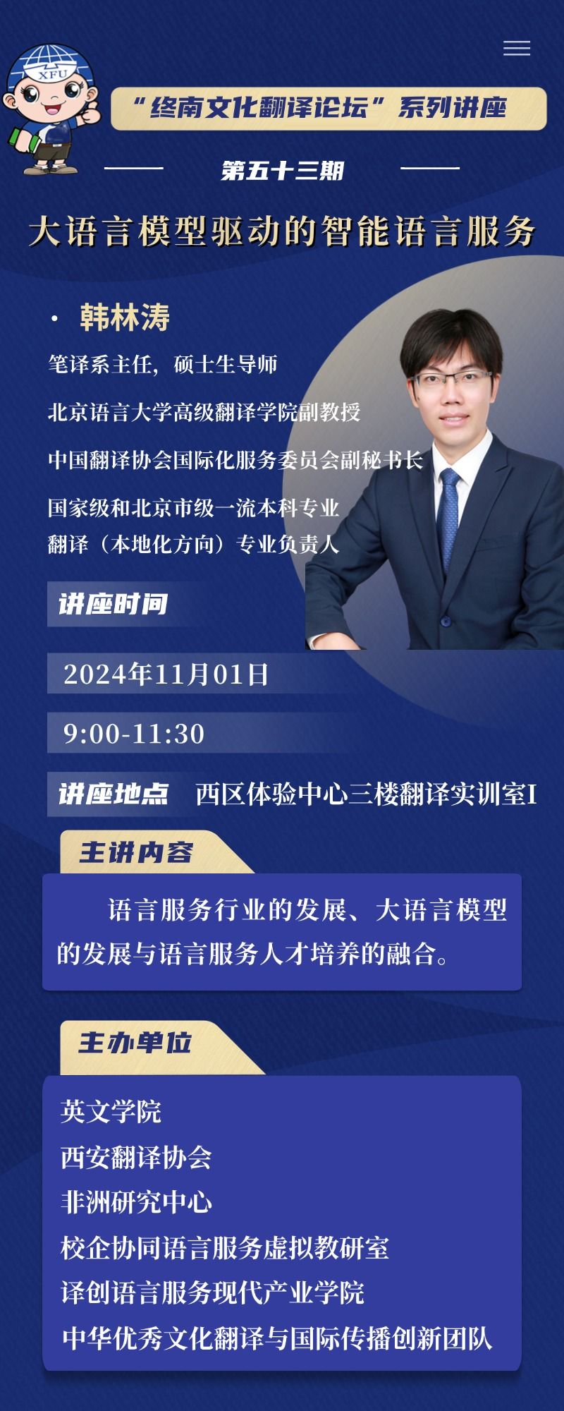 主题:“终南文化翻译讲坛”系列讲座第五十三期——大语言模型驱动的智能语言服务