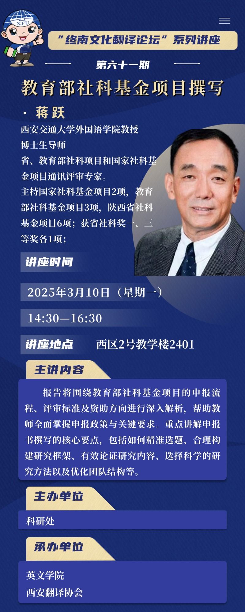 主题:“终南文化翻译讲坛”系列讲座第六十一期——教育部社科基金项目撰写