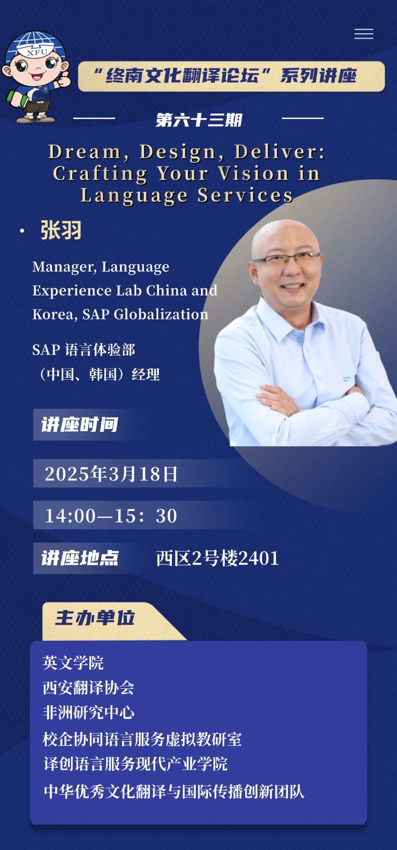 主题:“终南文化翻译讲坛”系列讲座第六十三期——Dream, Design, Deliver: Crafting Your Vision in Language Services