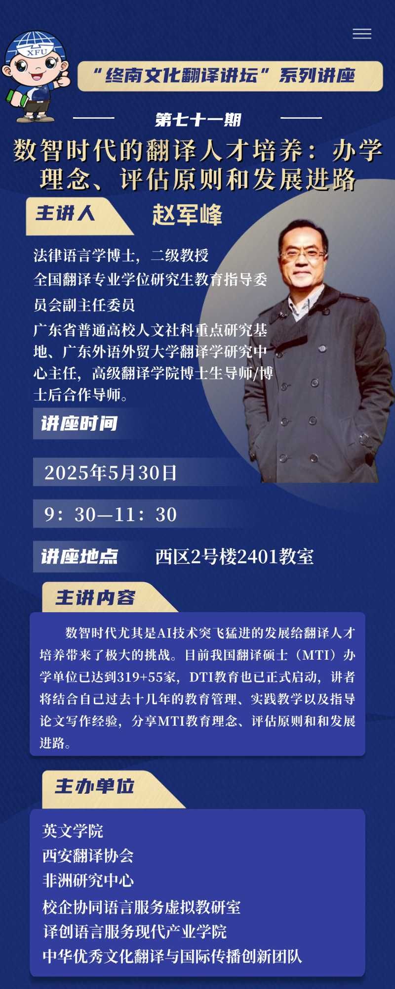 主题:“终南文化翻译讲坛”系列讲座第七十一期——数值时代的翻译人才培养:办学理念、评估原则和发展进路