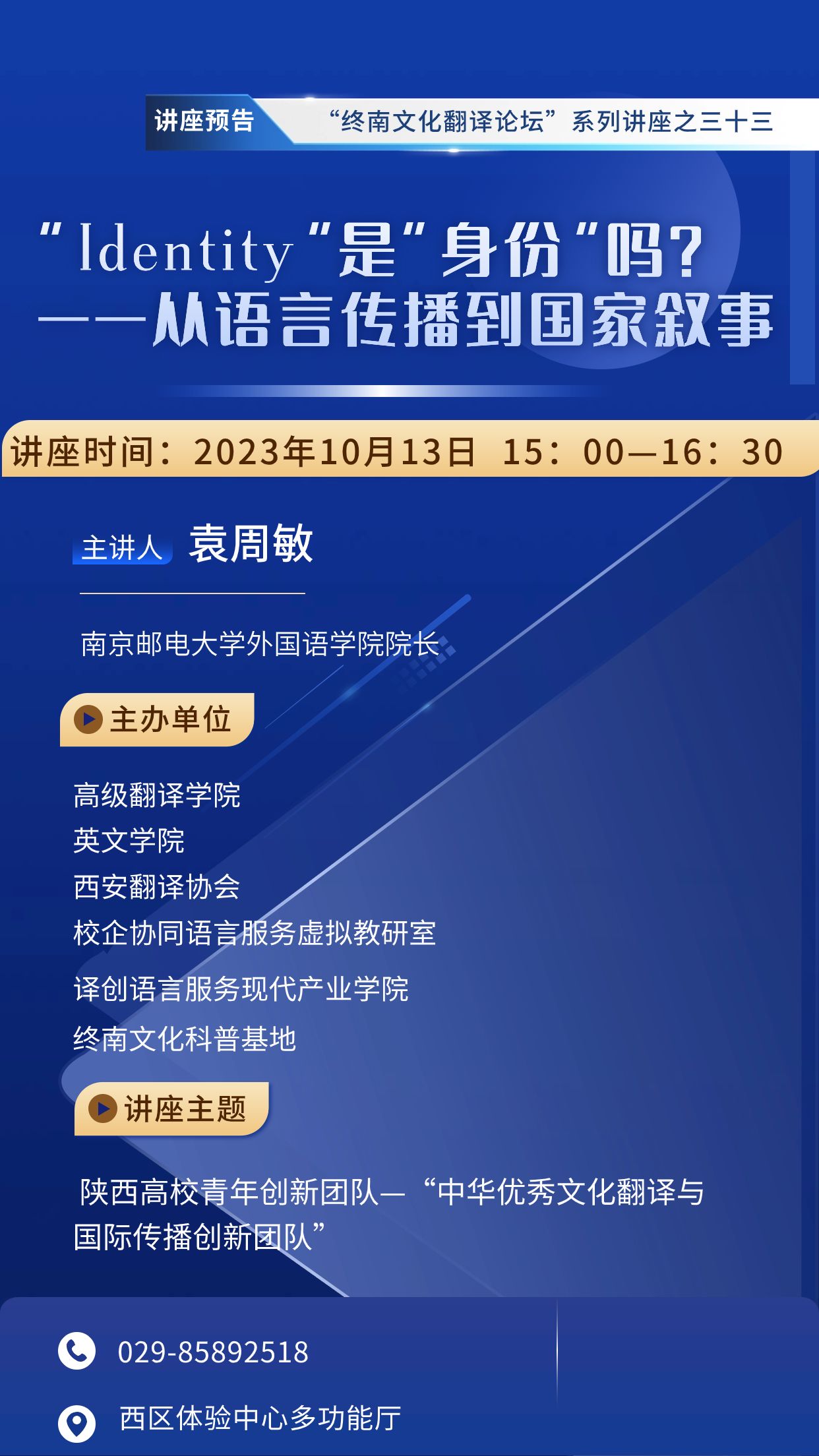 讲座主题:“终南文化翻译论坛”系列讲座--”Identity"是"身份”吗?-从语言传播到国家叙事