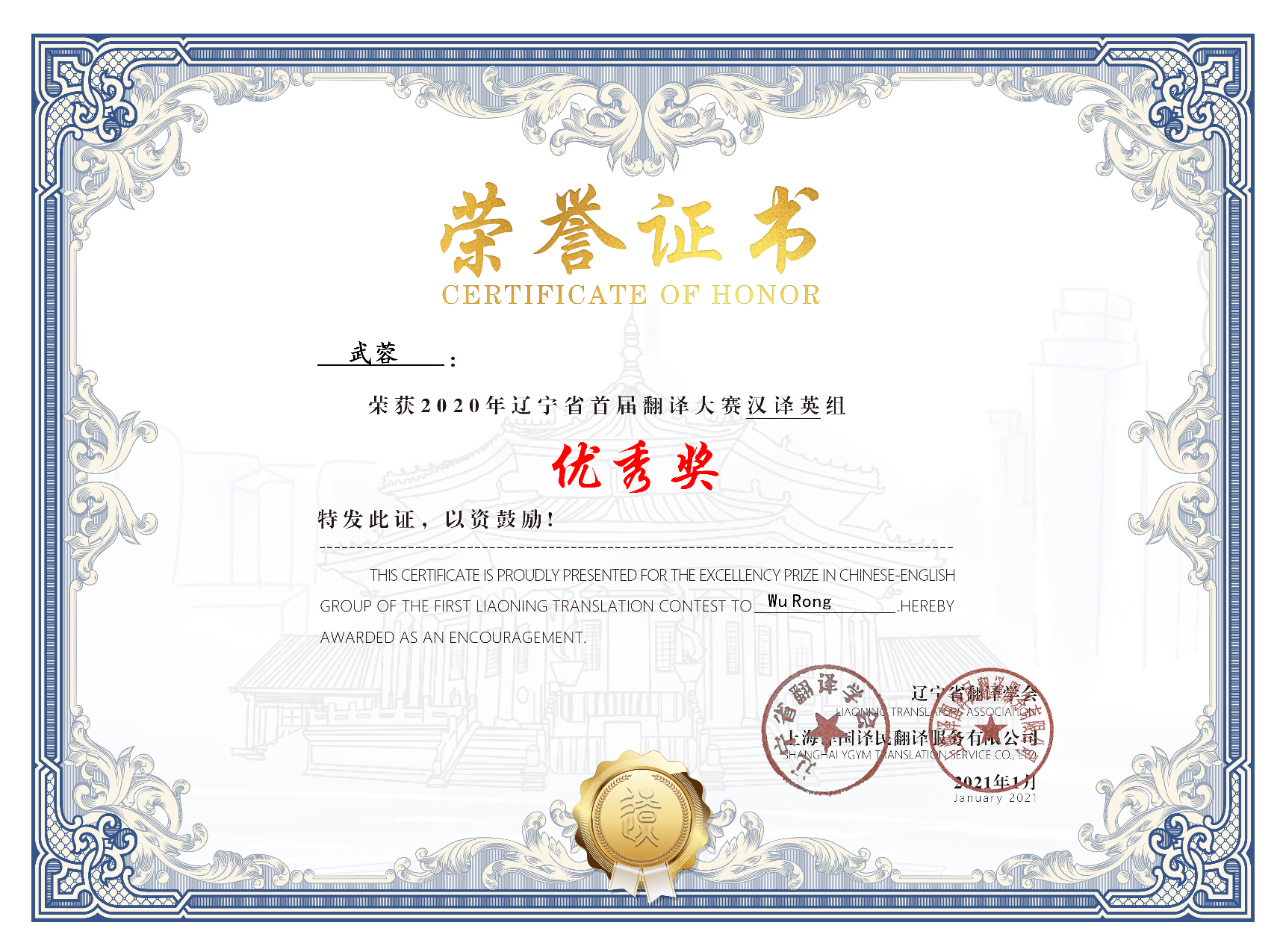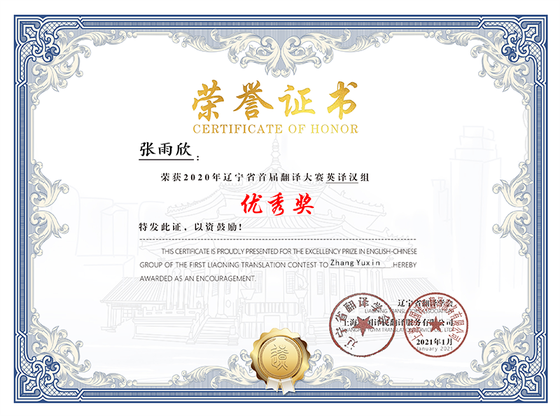 首届辽宁省翻译大赛由辽宁省翻译学会主办,译国译民翻译服务有限公司承办,旨在促进复合型、应用型翻译人才培养以及翻译专业教育与教学质量的提升,为高校在校学生及社会各界翻译爱好者提供翻译实践实训平台与机会。首届大赛包含为英语、日语、俄语笔译,各语种分别设立“汉译外”与“外译汉”两个组别。每个组别各设一等奖2名、二等奖5名、三等奖10名、参赛人数各前30%为优秀奖。在首届辽宁省翻译大赛中,我院学生获得优秀奖两项。