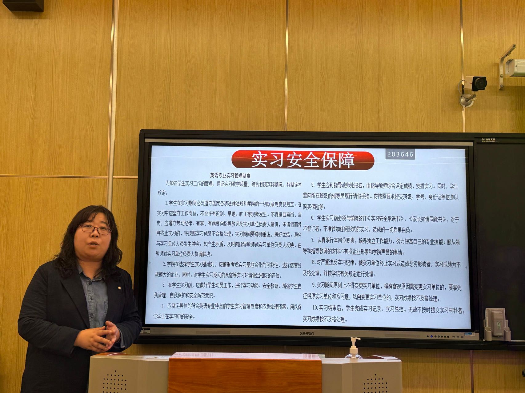 此次实习对象为2021级的102名英语专业的学生,实习单位为西安市浐灞第二十一小学、西安市浐灞第二十二小学。英语一系副主任赵玲为学生详细讲解了本次实习的总体情况、流程安排、内容和要求、教师职责、安全保障、入住译创基地的要求及注意事项等。