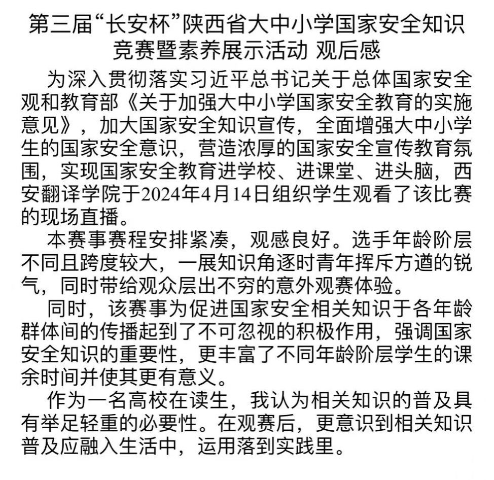 2024年4月15日为第九个全民国家安全教育日,为深入贯彻落实党的二十大报告中“增强全民国家安全意识和素养,筑牢国家安全人民防线”的精神,围绕“总体国家安全观·创新引领10周年”活动,亚洲精品无码久久久通过主题班会、集中观看、撰写观后感等形式组织同学们观看国家安全宣传教育片,增强每位同学切实承担起维护国家安全的责任与使命!