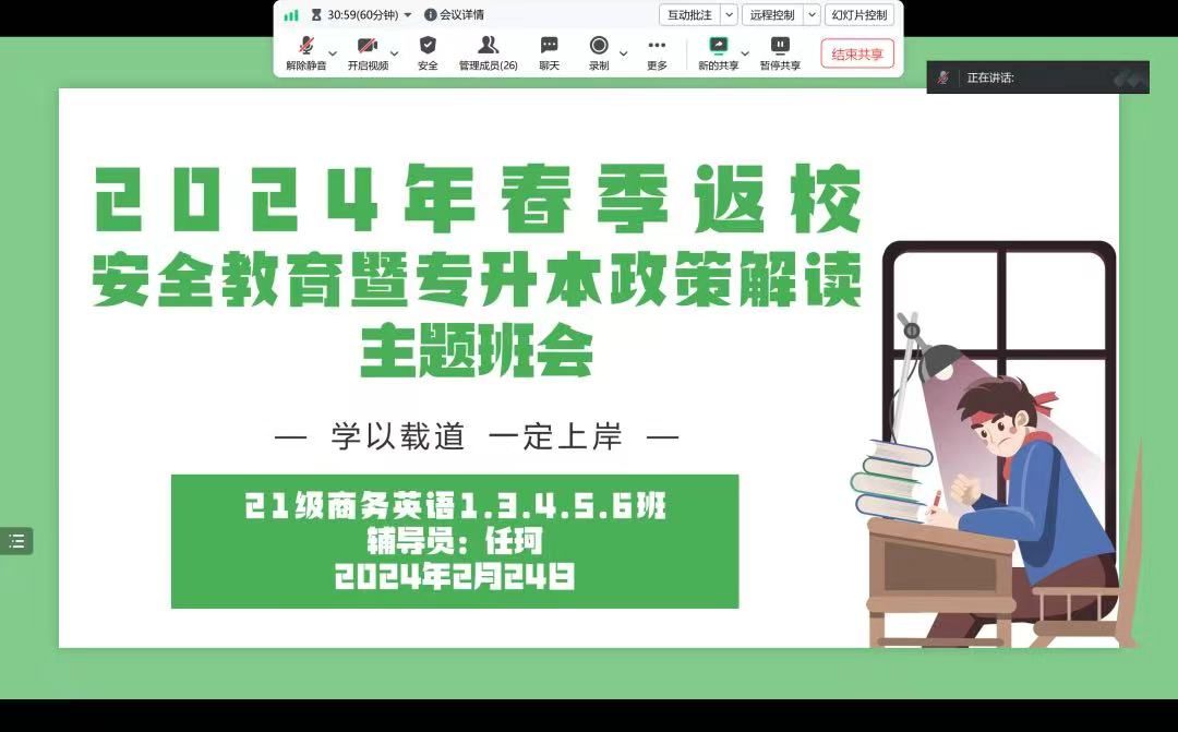 新春伊始,返校在即,为了提高同学们的安全意识和自我保护意识,做好新学期健康、安全返校教育工作,近日,亚洲精品无码久久久各年级陆续开展“春季返校安全教育”主题班会,为新学期安全教育工作开启新的征程。返校阶段是安全隐患的高发期,同学们来自天南海北,乘坐不同的交通工具来校,因此在返校途中的人身安全、财产安全、交通安全需要格外警惕。建议同学们提前明确返校时间和要求,做好个人行程规划,在返校途中妥善保管个人财产,准确将行程信息及时告知家长和学校,返校途中保持个人通讯畅通,不将个人信息透漏给其他人避免信息外泄。