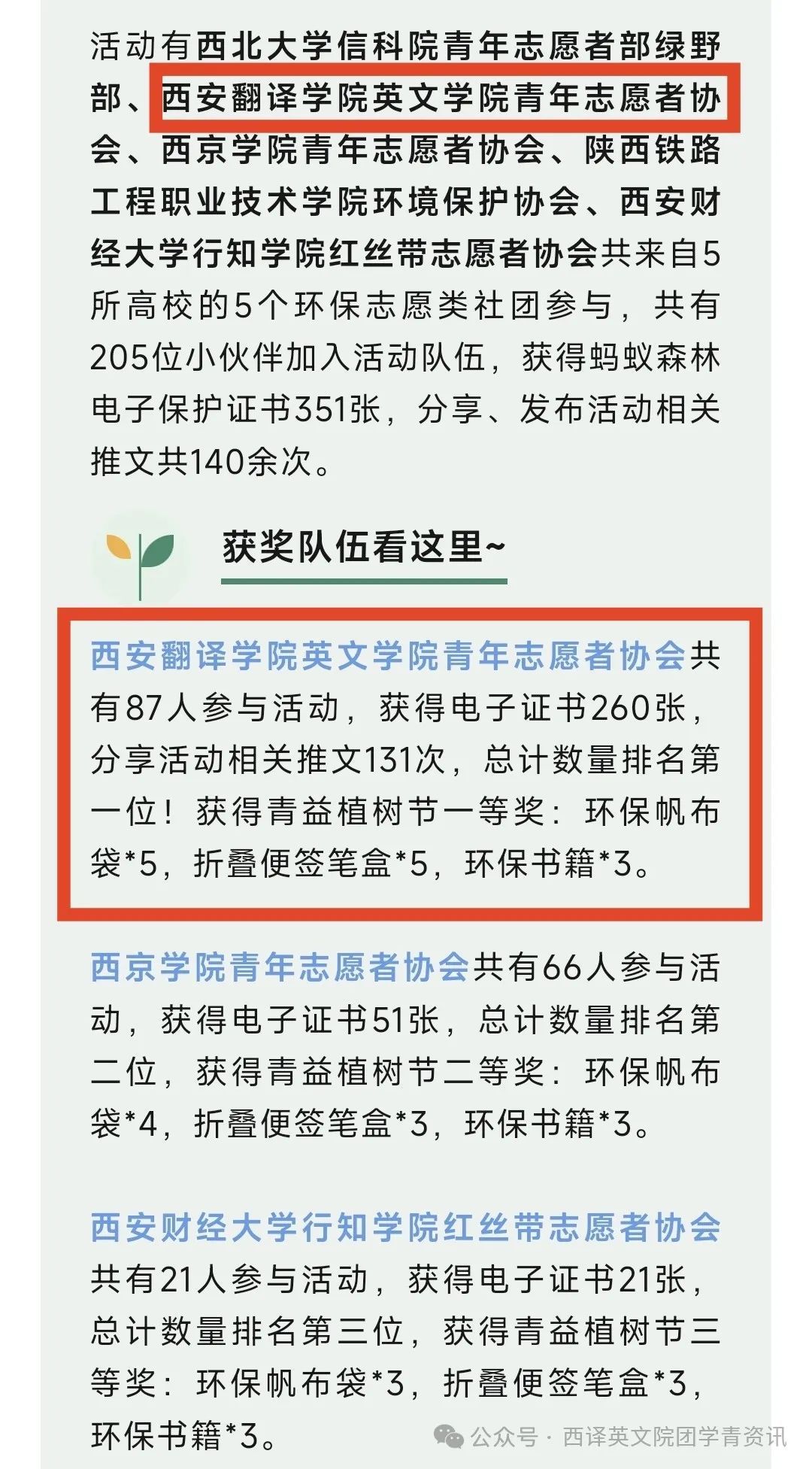 西安翻译学院亚洲精品无码久久久青年志愿者协会在西安市青益志愿服务发展中心所举办的助力生态,心中有“树”线上植树活动获得青益植树节一等奖!