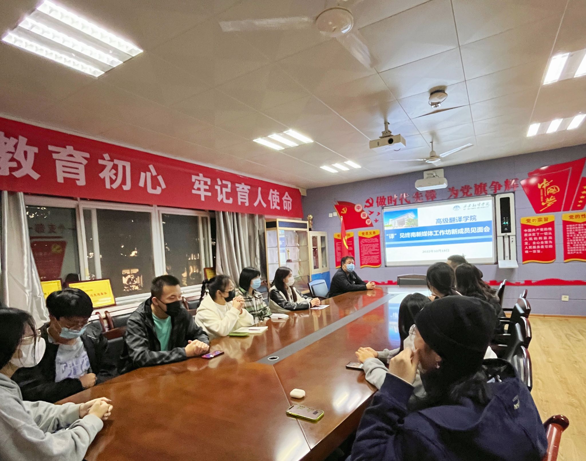 又迎来了新鲜血液,高级翻译学院“译”见终南新媒体工作坊于2022年10月18日19点在2号楼会议室召开新成员见面会。本次见面会参会的有党委书记、行政副院长蒋小军,综合办主任简实,工作坊负责老师李栋及工作坊全体成员。见面会由李栋主持。