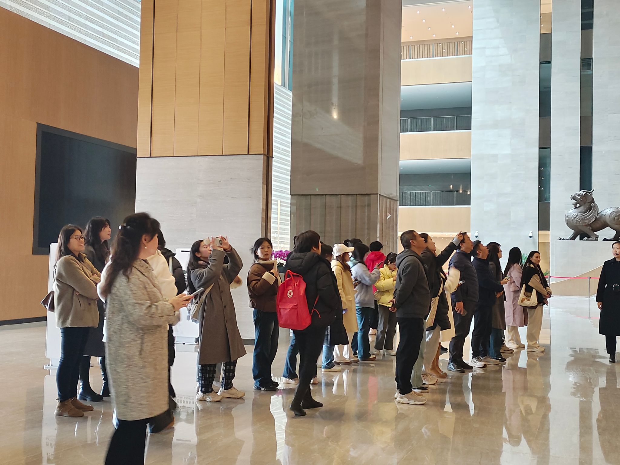 进入接待大厅,专业讲解员对中国国家版本馆的版本馆的建设规划、项目设计、收藏版本、建筑特点等情况以及中央总馆文瀚阁、西安分馆文济阁、杭州分馆文润阁、广州分馆文沁阁四座版本馆进行了讲解介绍,接着依次进入了序厅,迎面而来看到的是矗立着一排长90米、高20米的四层举行通顶书墙,藏书丰富令人震撼,在参观《楮墨遗珍万里同风——丝绸之路版本展》展厅,大家通过约600种古丝绸之路文献版本的展出,进一步了解了古往今来丝绸之路沿线国家交流互鉴的故事和丝绸之路文明。最后讲解员带领参观《楮墨遗珍 万里同风——丝绸之路版本展》参观了“中华文明 民族根脉”、“延安精神 红色血脉”、“民族复兴 伟大梦想”三大部分内容,尤其是“延安精神红色血脉”展区,陈列的书籍、图片、手稿等记录着中国共产党的百年光辉历程和革命先驱的战斗精神。