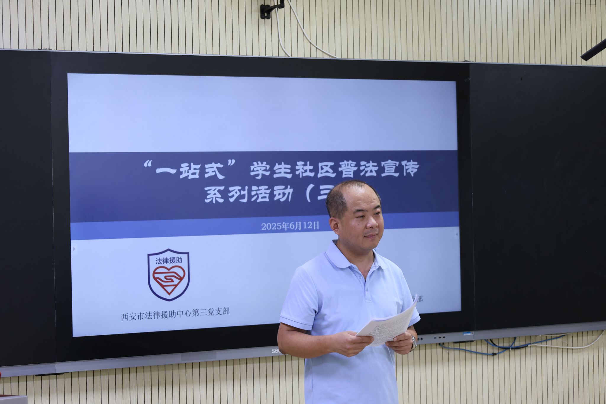 活动由西安市法律援助中心第三党支部书记张博主持。现场特别邀请市法律援助中心郭娜、张凡律师担任评委。竞赛围绕大学生就学、实习、就业等全周期可能面临的法律场景展开,题目涵盖购买翻新产品维权、服务未履约处理、职场知识产权归属、工作设备损害责任认定及大学生房屋租赁合法性等具体问题。张博书记以情景化提问引导同学们抢答,现场气氛热烈,同学们积极参与、应答如流。